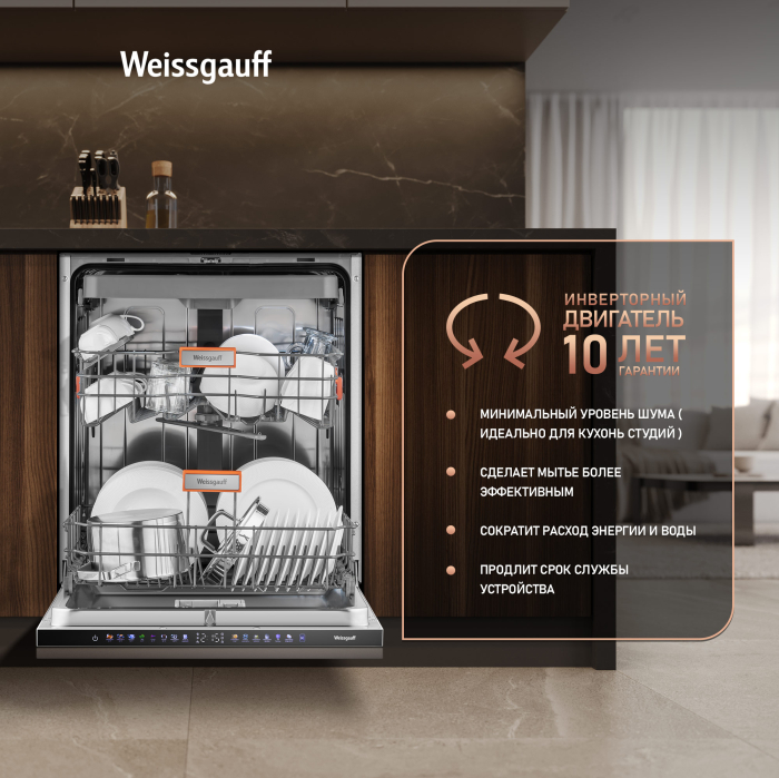 Умная встраиваемая посудомоечная машина с Wi-Fi, лучом на полу, авто-открыванием и инвертором Weissgauff