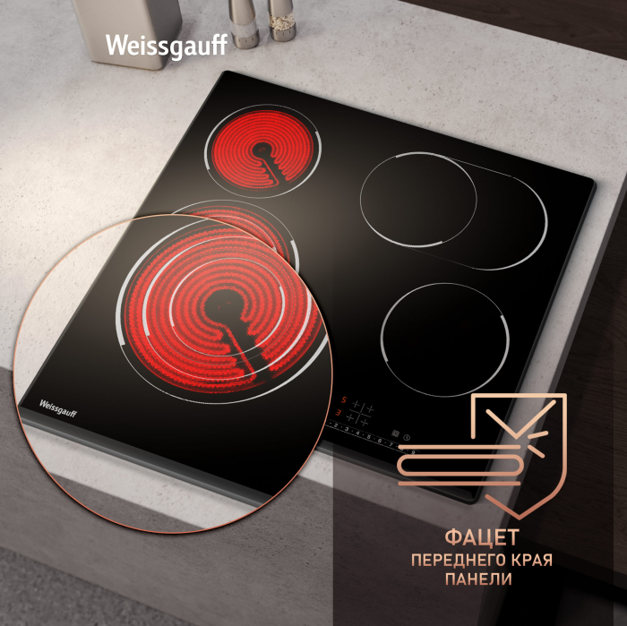 • Конфорки: 4 конфорки: 1x 230/138 мм*2,2/1.1 кВт (двойной контур), 1х 200 мм*1,8 кВт, 2х 165 мм*1,2 кВт