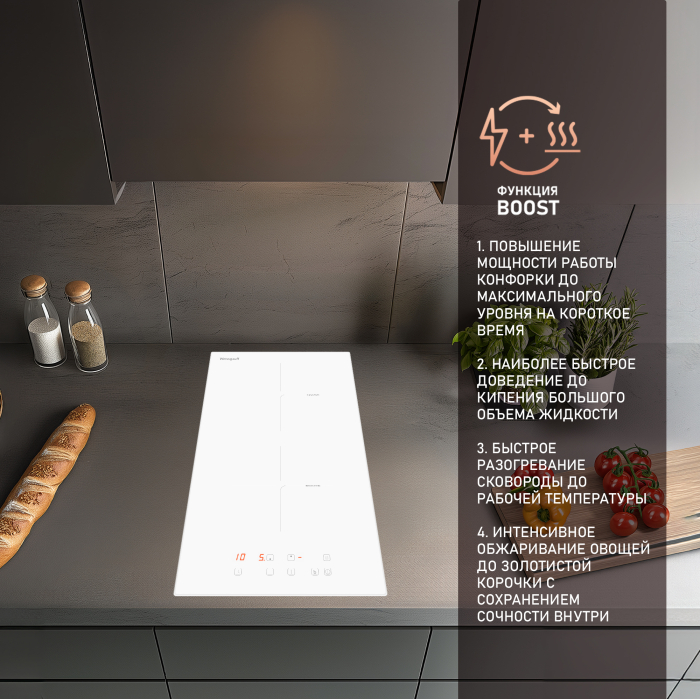 • Конфорки: 1 индукционная FLEX-зона + 1 индукционная конфорка