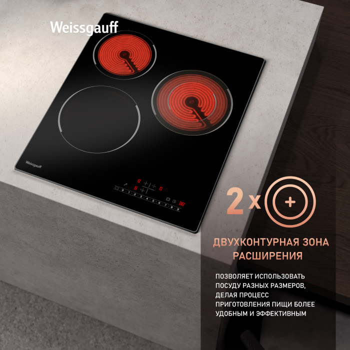 • Конфорки: 3 конфорки: 1х1,8 кВт, 1х1,2 кВт, 1х1/2 кВт (двойной контур)