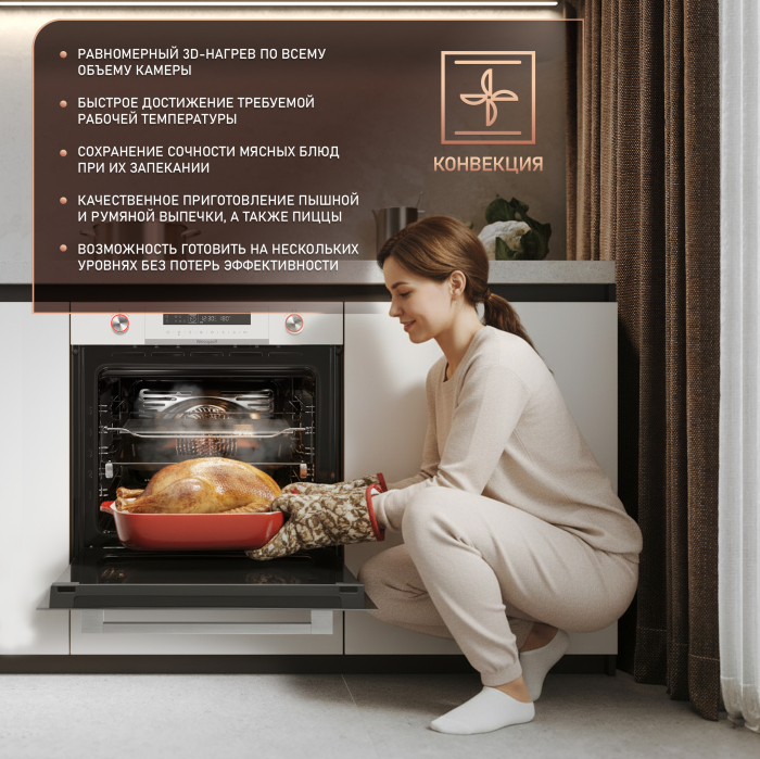 • Функции: 15 функций: Классическая выпечка (верхний и нижний нагрев), Горячий воздух (конвекция), Интенсивная выпечка (нижний и верхний нагрев с конвекцией), Гриль, Двойной гриль с конвекцией, Двойной гриль, Пицца, Нижний нагрев, Верхний нагрев, Горячий воздух (ЭКО), Режим шеф-повара, Размораживание, Тесто, Сушеные фрукты, Поддержание тепла.
