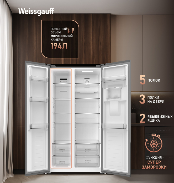 Отдельностоящий холодильник с инвертором и подачей воды Weissgauff