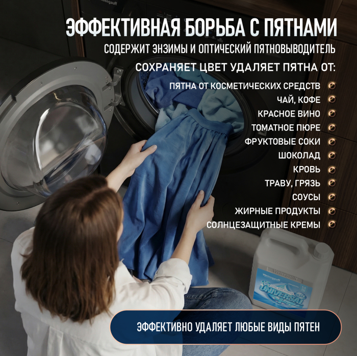 • Особенности: Стирка натуральных (хлопок, лён) и синтетических тканей, включая полиэстер и лайкру.