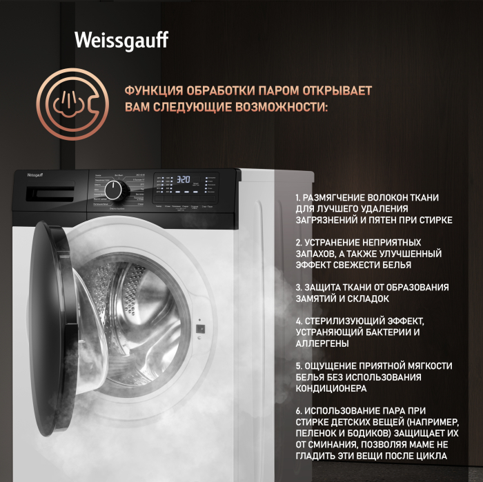 Cтиральная машина с прямым приводом, инвертором и паром Weissgauff