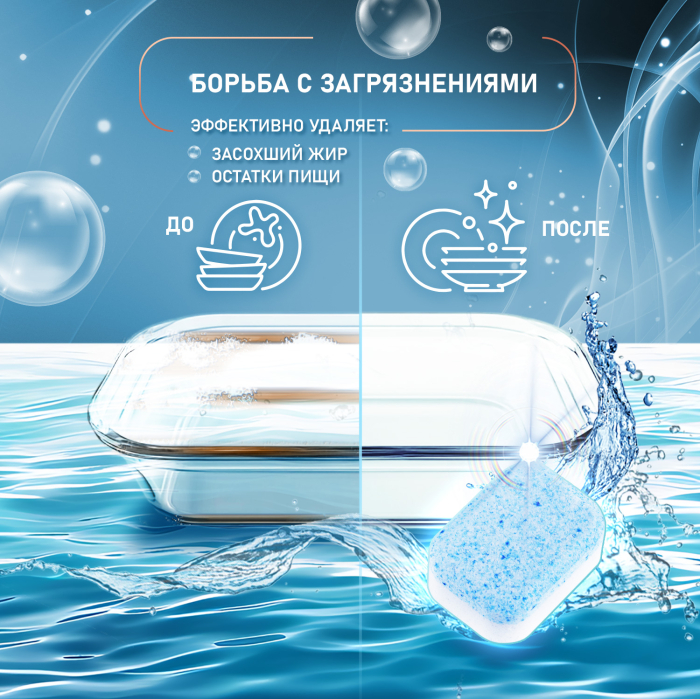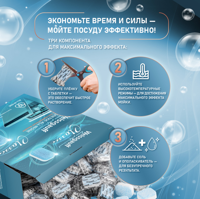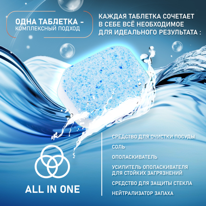 • Особенности: All in One, высокоэффективная очистка посуды в посудомоечной машине