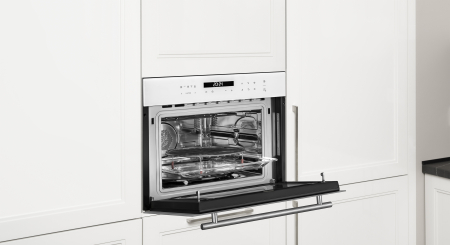 Встраиваемый компактный духовой шкаф с микроволнами , который сочетает в себе сразу два полноценных устройства: духовой шкаф с конвекцией и грилем, а также микроволновую печь с отдельными набором настроек и возможностью использования комбинированного режима.