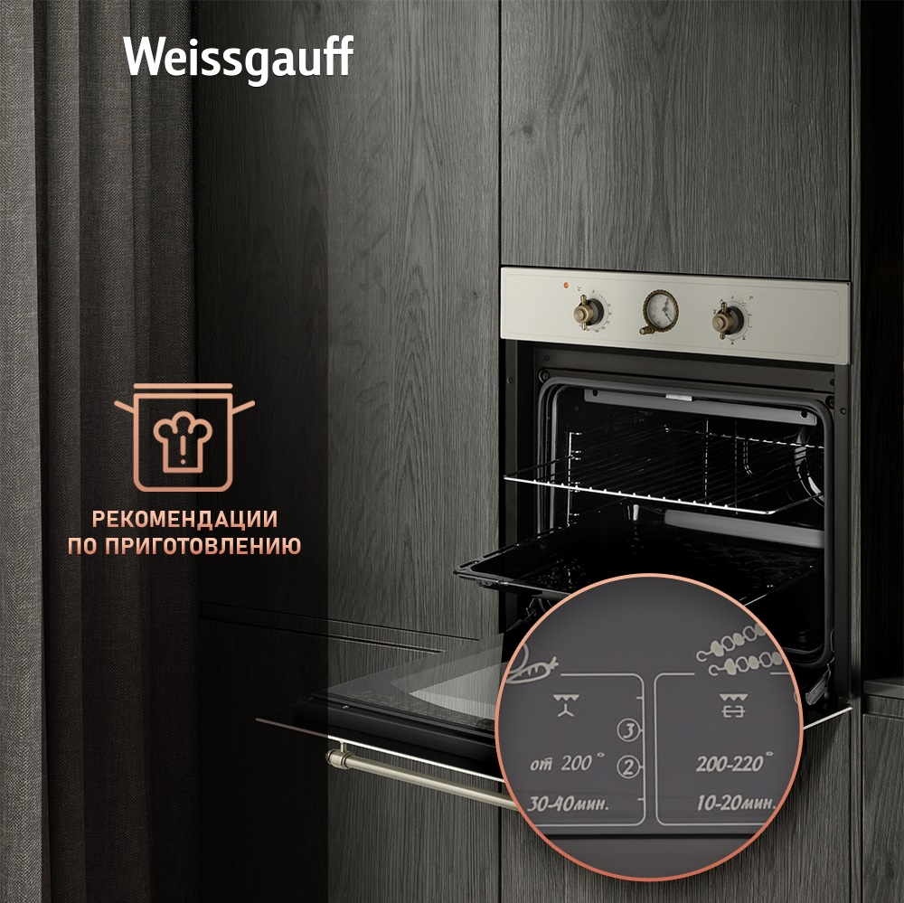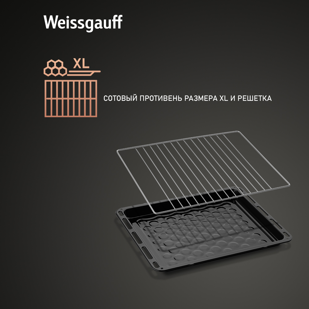 Объем XL 60 литров дает вам полную уверенность в том, что приобретая этот духовой шкаф, вы сможете разместить в нем сразу весь необходимый объем пищи, и даже профессионально работать на нескольких уровнях одновременно, порадовав себя и своих близких настоящим пиром, приготовленным в духовом шкафу Weissgauff на действительно ресторанном уровне.