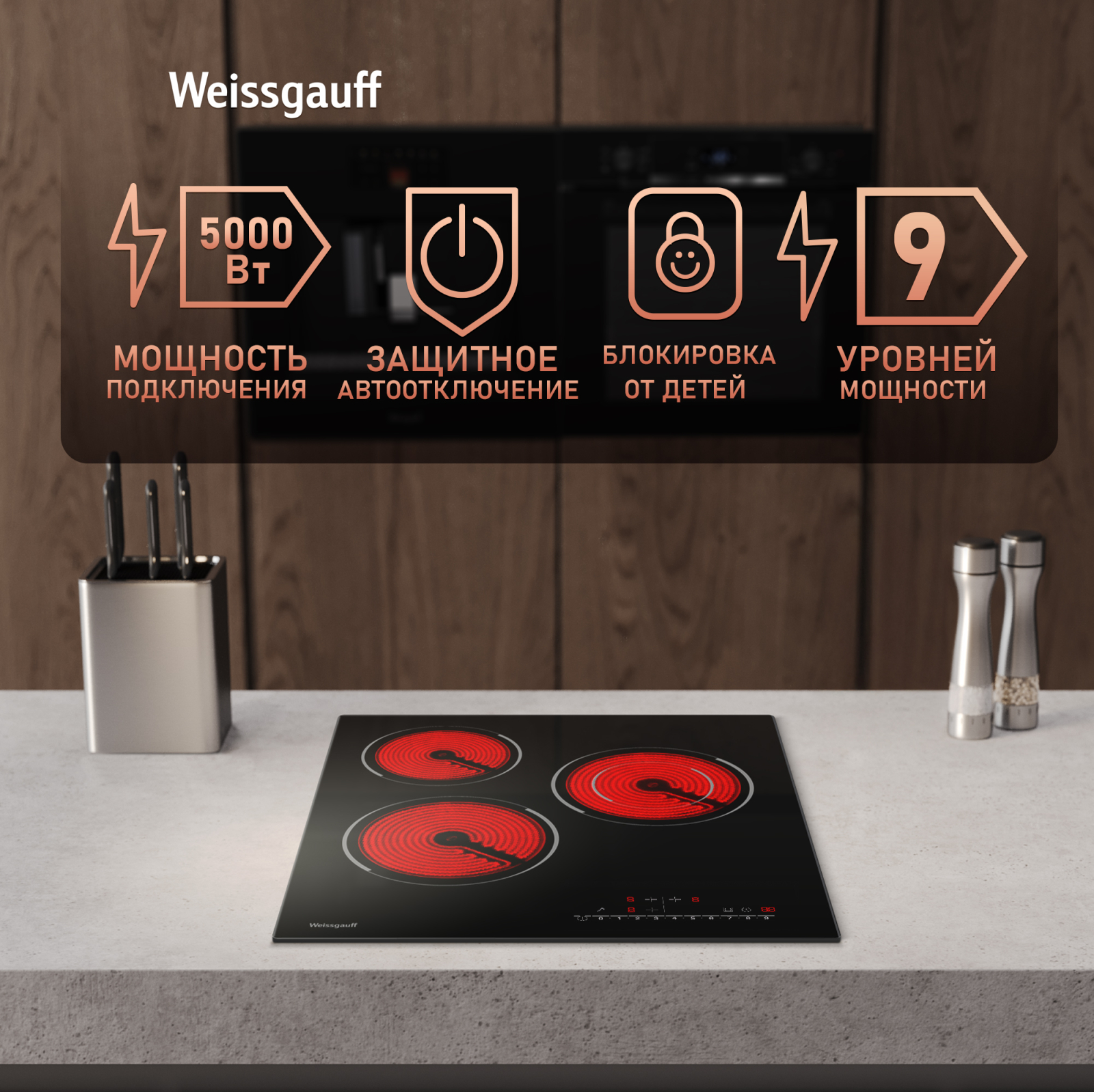 Блок управления-слайдер, позволяющий всего в одно касание выставить необходимый вам уровень нагрева любой из конфорок и делающий процесс управления панелью значительно более быстрым и легким.