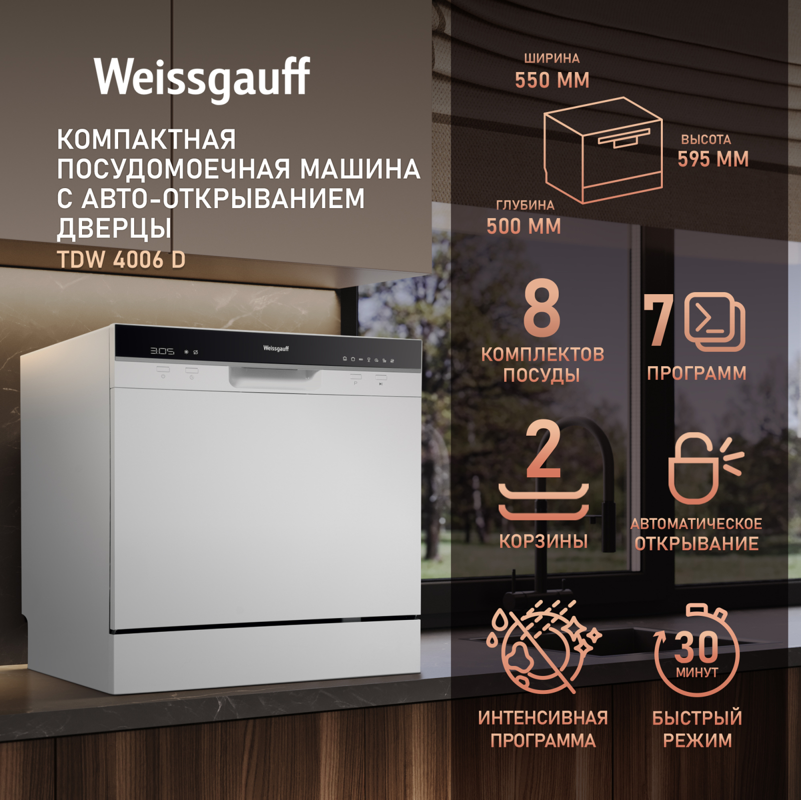 Настольная посудомоечная машина Weissgauff, рассчитанная на 8 комплектов посуды, имеющая функцию самоочистки, полностью электронное управление и богатый набор из 7 программ - это модель, которая отличается не только компактностью, но и высокой и функциональностью.