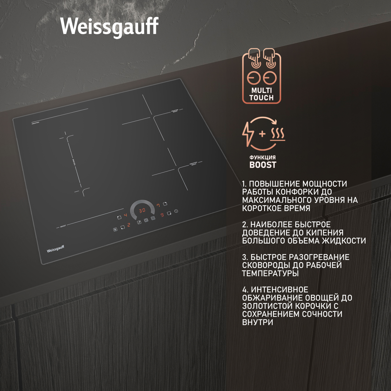 Варочная панель, оснащённая технологией непрерывного нагрева, свободной зоной Flex Zone, а также двумя независимыми конфорками и специальным круговым слайдером One Touch - это наиболее передовая из всех индукционных панелей Weissgauff, являющаяся поистине вершиной немецкого качества и технологий