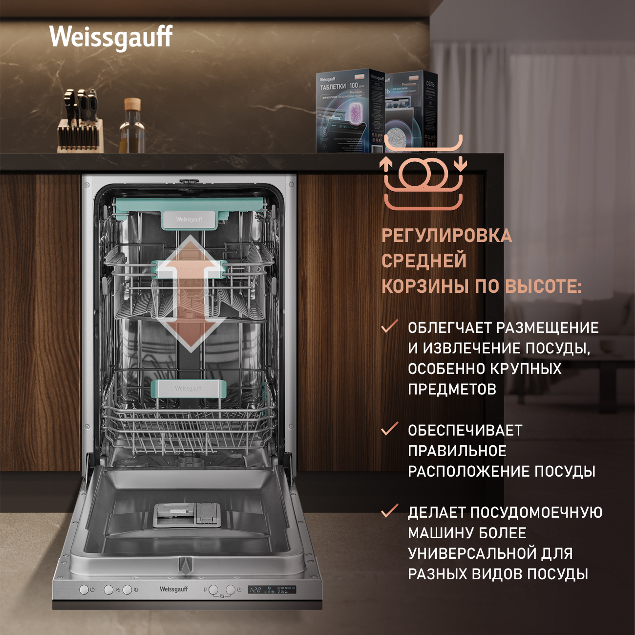 До 10 комплектов посуды одновременно вы можете расположить в данной посудомоечной машине, благодаря современным продуманным и эргономичным корзинам, которыми Weissgauff оснастили эту модель