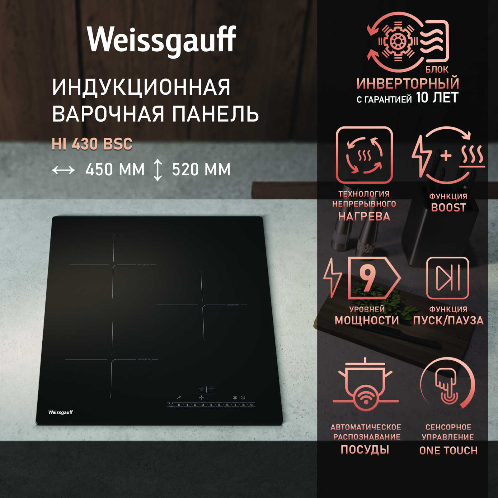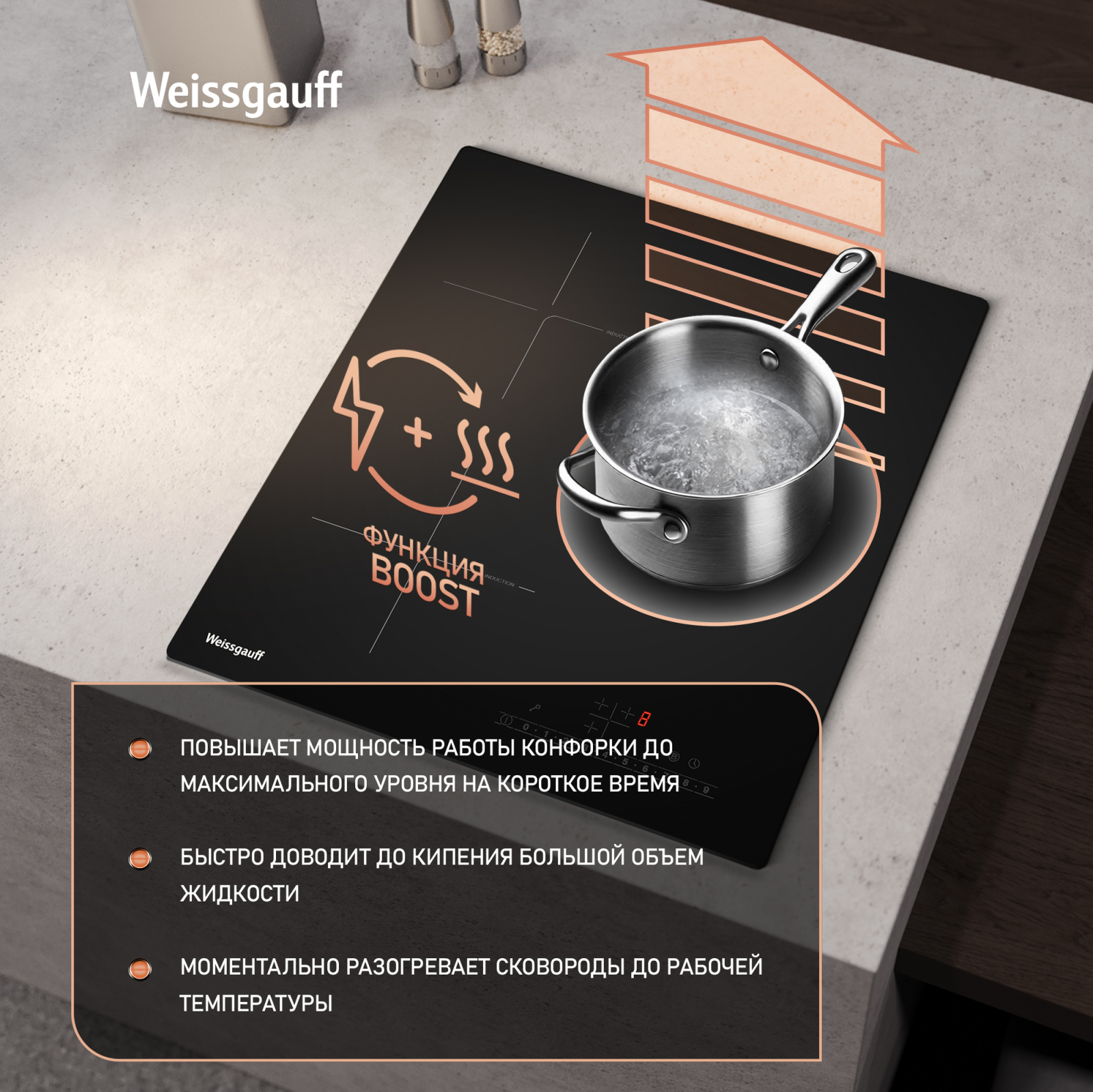 Индукционная панель Weissgauff с особым дизайном конфорок Cross-Zone и непрерывным нагревом выводит на новый уровень понимание того, насколько эффективной может быть компактная индукционная варочная поверхность шириной всего 45 см!