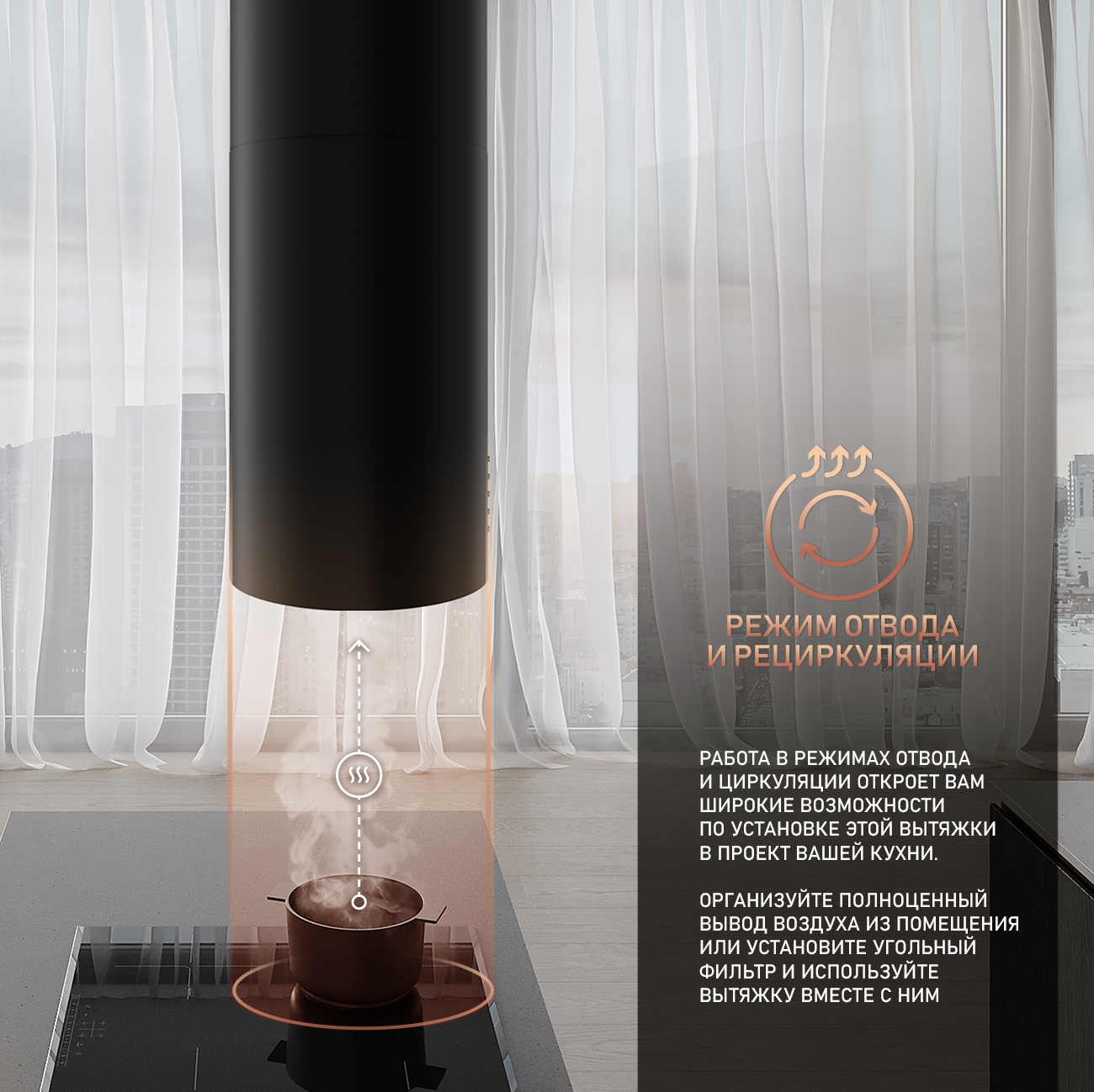 Островная установка позволяет закрепить вытяжку в любом удобном месте кухни, не привязываясь к стене, а также открывает широкие возможности по более свободному перемещению техники и мебели при будущей перепланировке помещения!