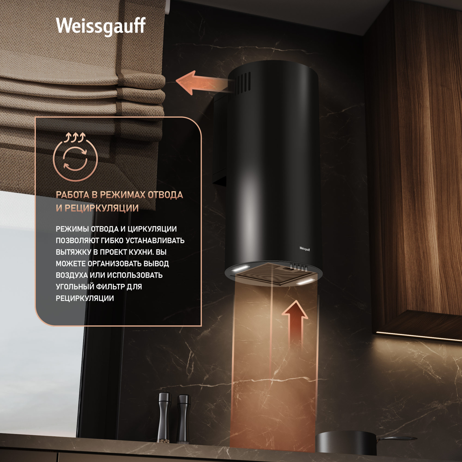 Работа в режимах отвода и циркуляции откроет вам широкие возможности по установке этой вытяжки в проект вашей кухни. Организуйте полноценный вывод воздуха из помещения или установите угольный фильтр и используйте вытяжку вместе с ним - какой бы вариант вы ни выбрали, модель от Weissgauff сделает это возможным!