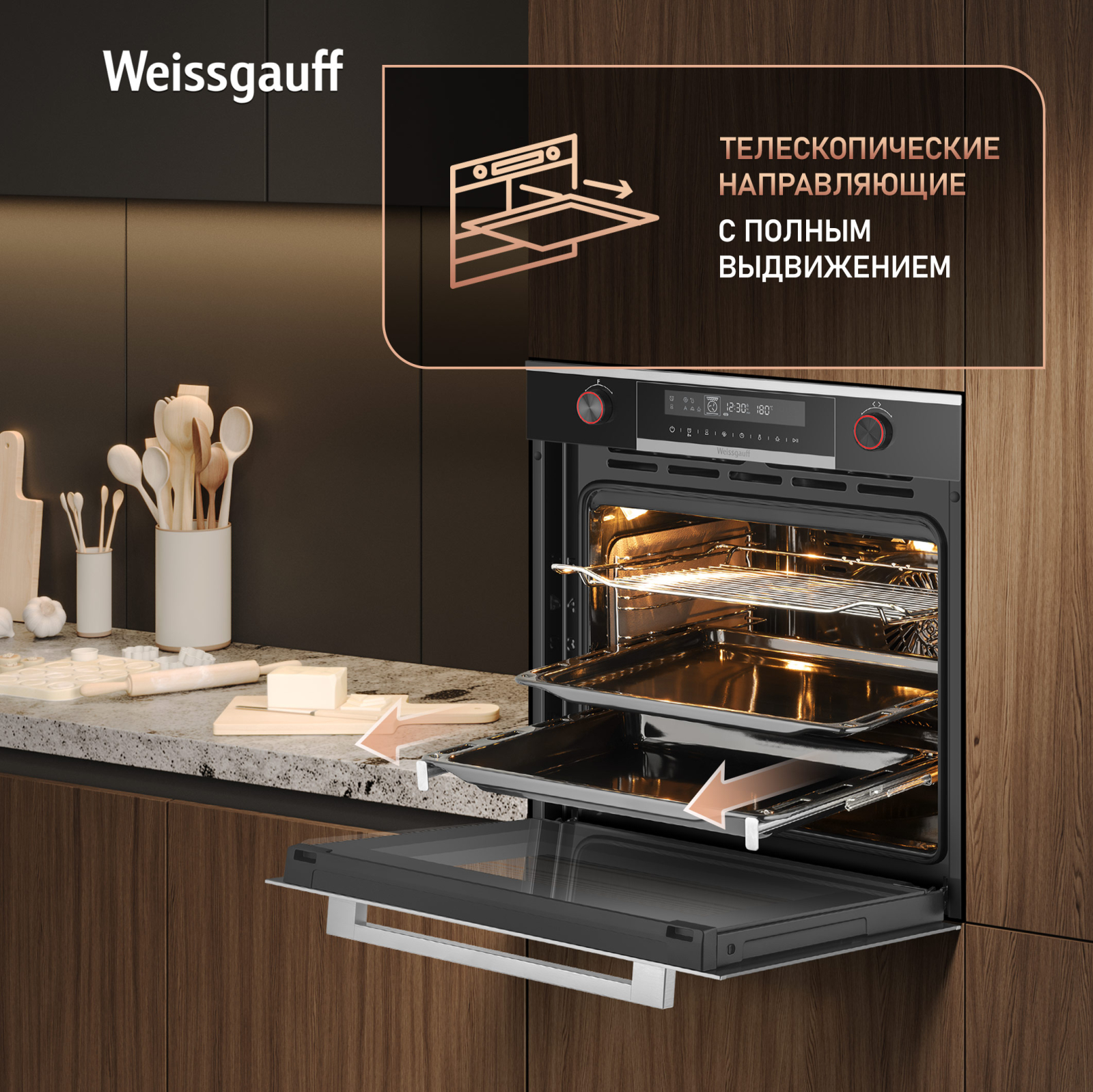 Новое поколение электрических духовых шкафов от Weissgauff предлагает модель, выполненную в черном закаленном стекле с декоративными элементами черного цвета, имеющую поворотные рукоятки с подсветкой, а также большой дисплей с сенсорным управлением и расширенной индикацией. Тройное остекление дверцы отражает все то легендарное внимание к деталям, которым так славится продукция Weissgauff. Данный духовой шкаф станет не только отличным приобретением для вашей кухни, но и настоящим украшением интерьера, отражающим все совершенство вашего вкуса и стиля!
