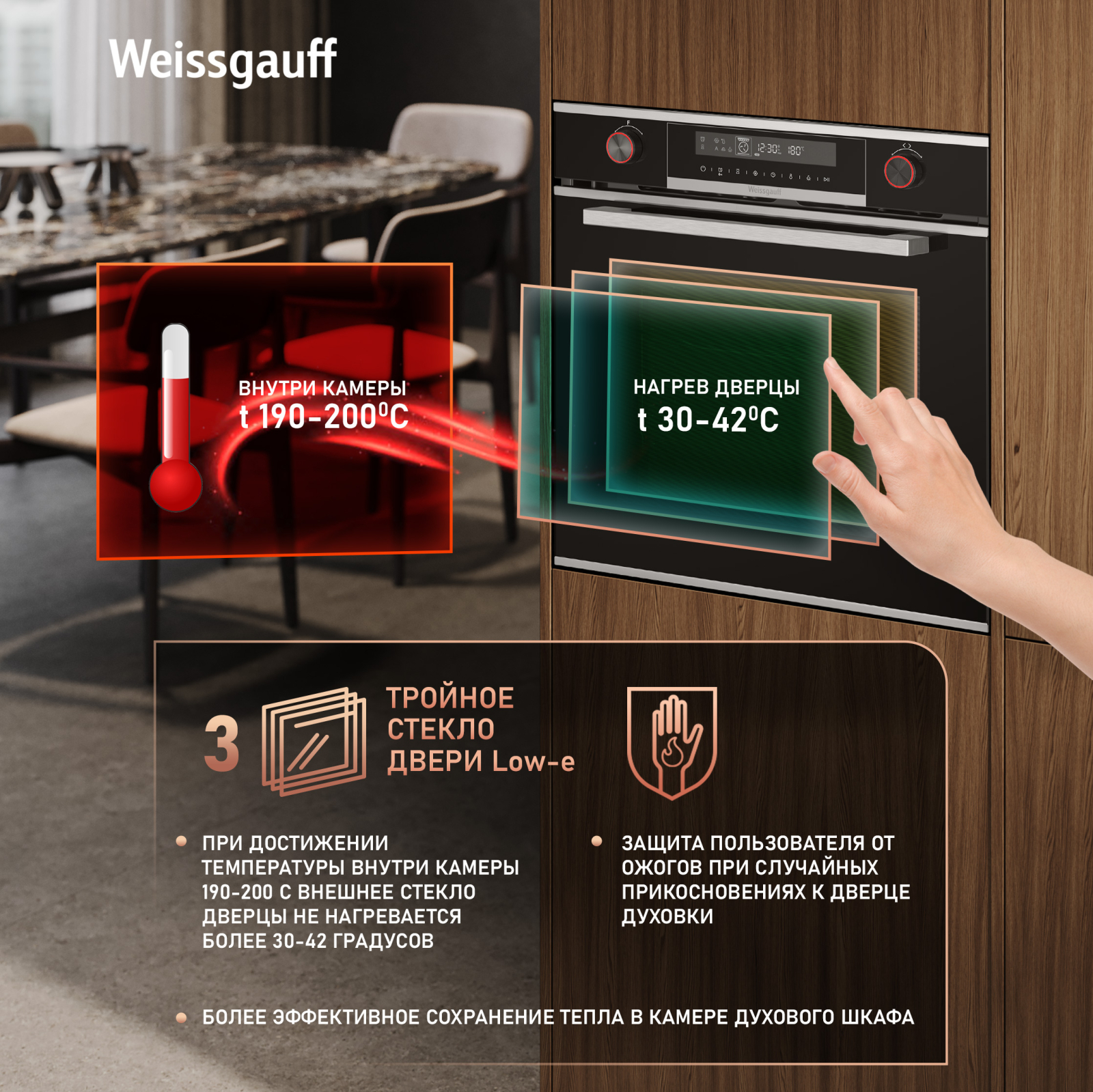 Тройное стекло дверцы, воплощающее в себе весь подход к безопасности и термозащите, который Weissgauff реализовали в данной модели. Теперь случайные прикосновения к дверце духового шкафа во время процесса приготовления еды больше будут не страшны, ведь мы позаботились о том, чтобы фронтальная сторона духового шкафа никогда не нагревалась до опасных температур.