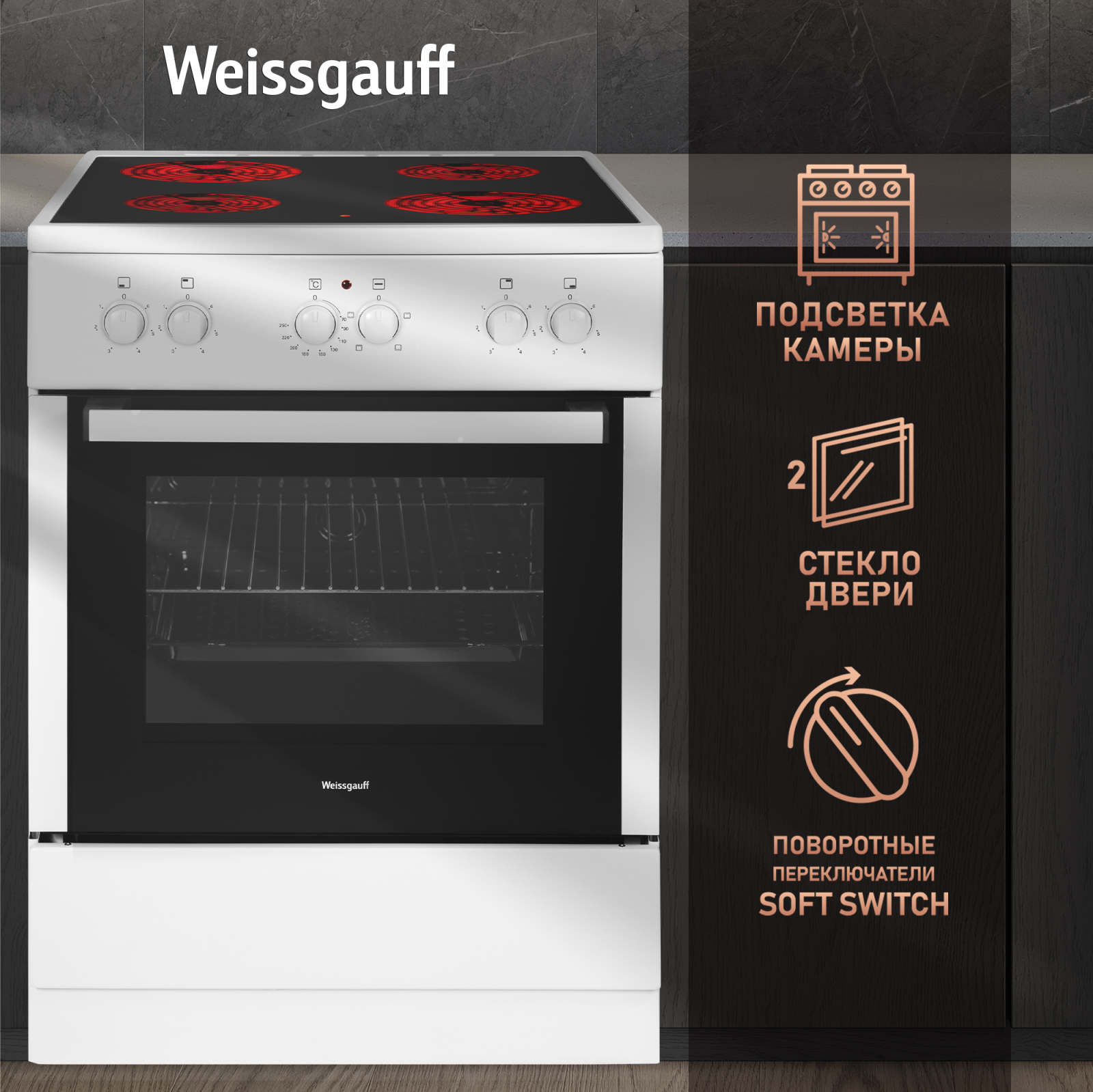 Дизайн, выполненный в белом цвете, станет финальным штрихом в совершенстве великолепного облика этой модели. Каждый раз, взаимодействуя с вашей плитой от Weissgauff, вы будете чувствовать, что это не только функциональное устройство, но и настоящее украшение вашей кухни!