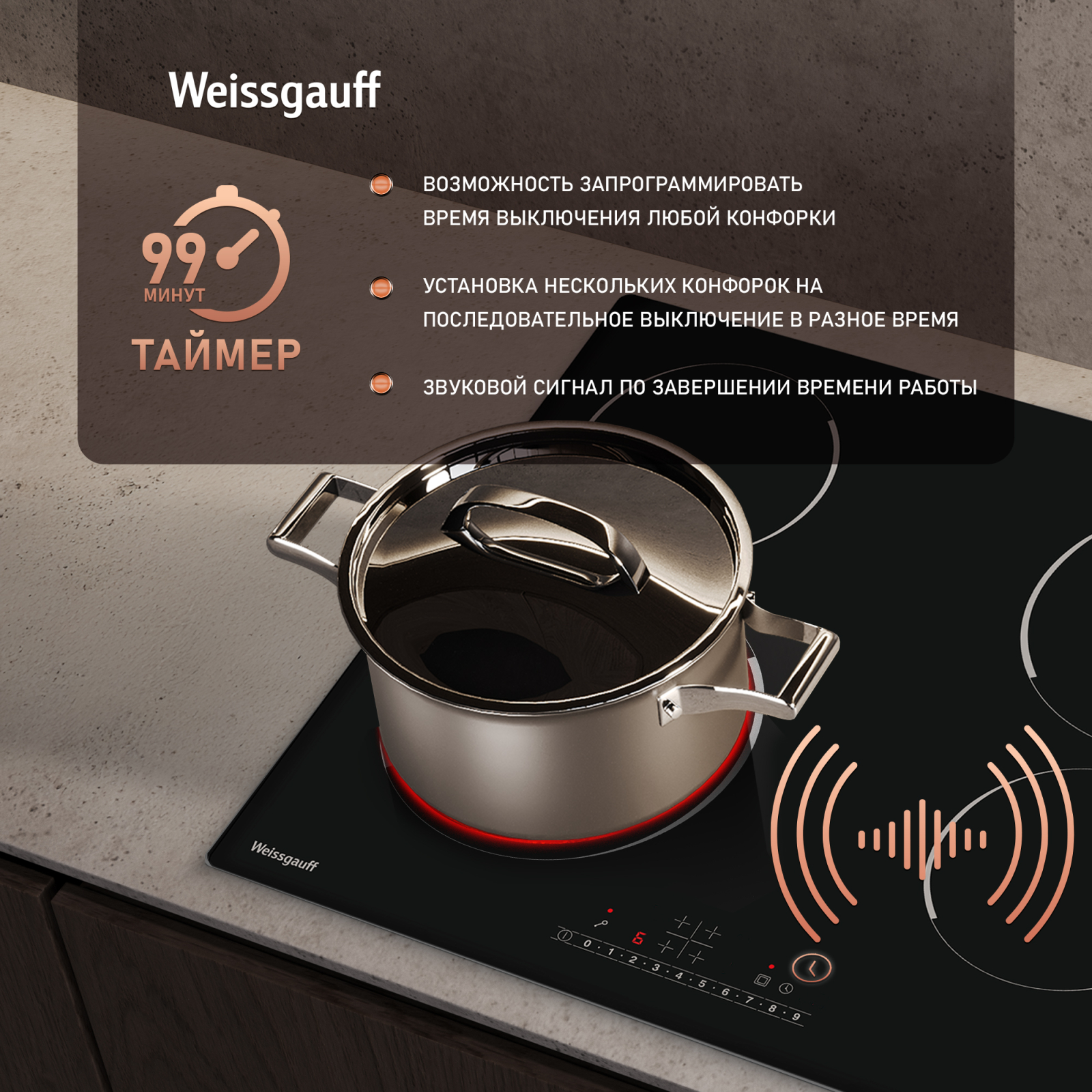 Таймер до 99 минут дает вам возможность запрограммировать время выключения любой конфорки, с точностью до минуты!