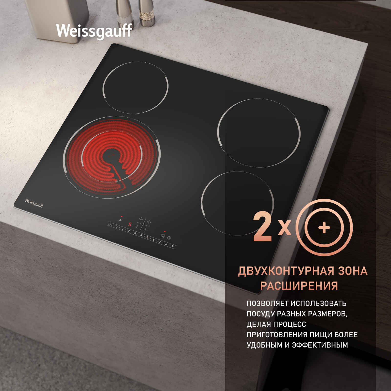 Двухконтурная зона расширения в передней левой конфорке, позволяющая адаптировать область нагрева как под крупную сковороду, так и под небольшую кастрюлю!