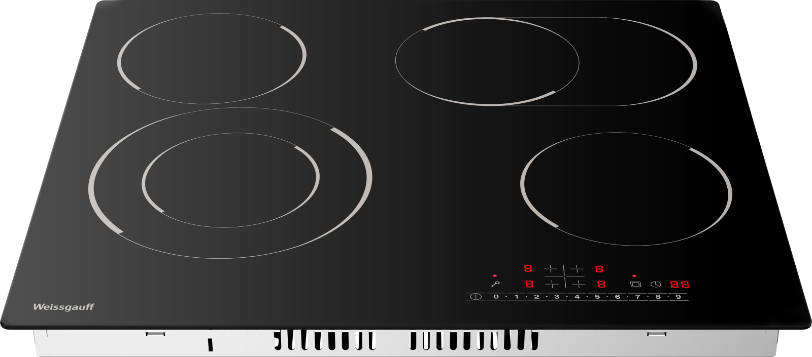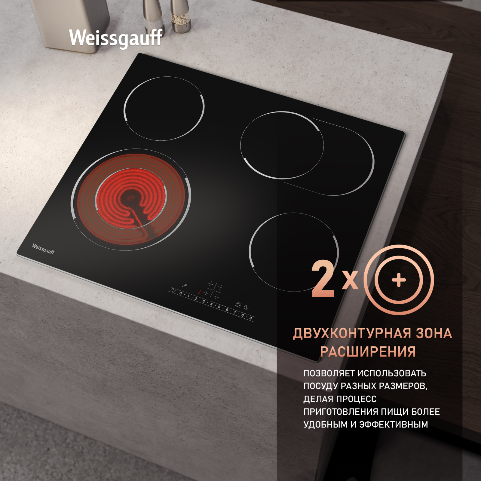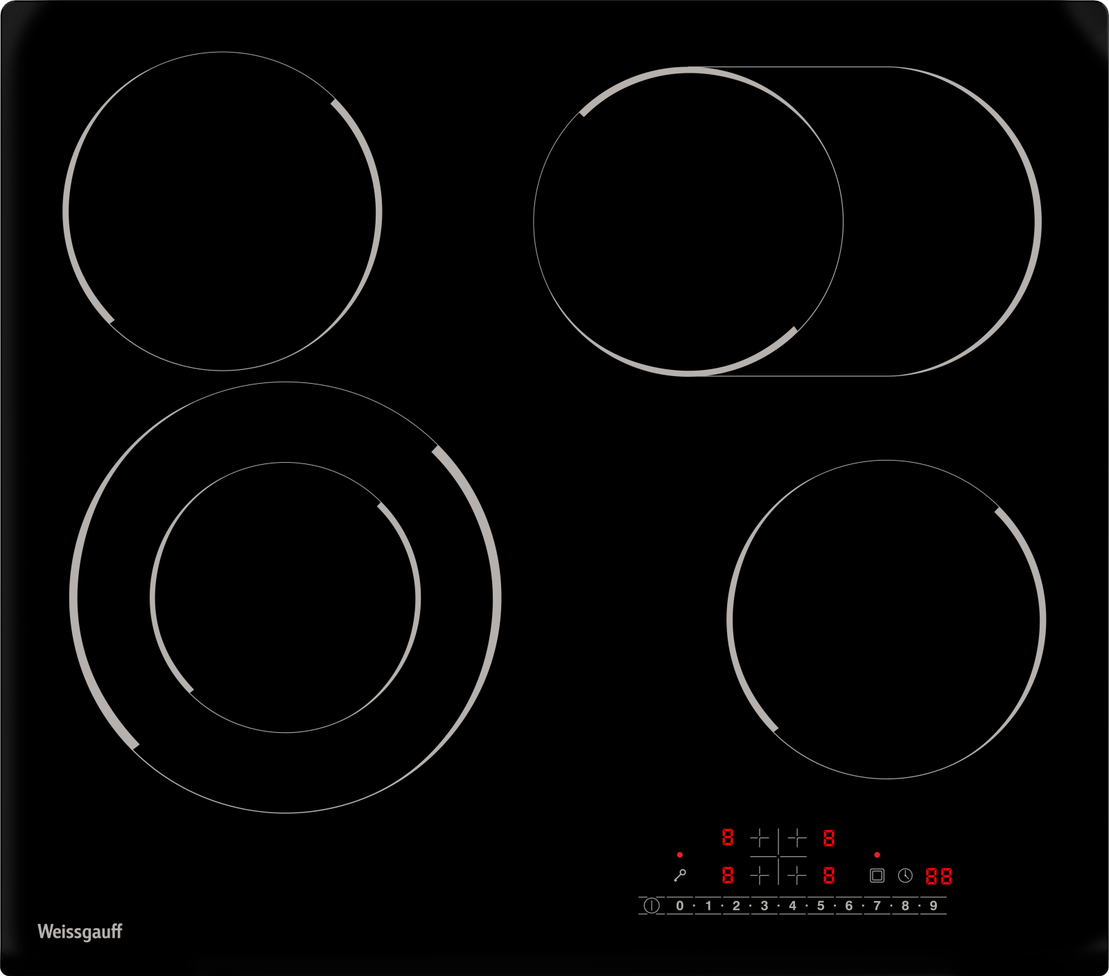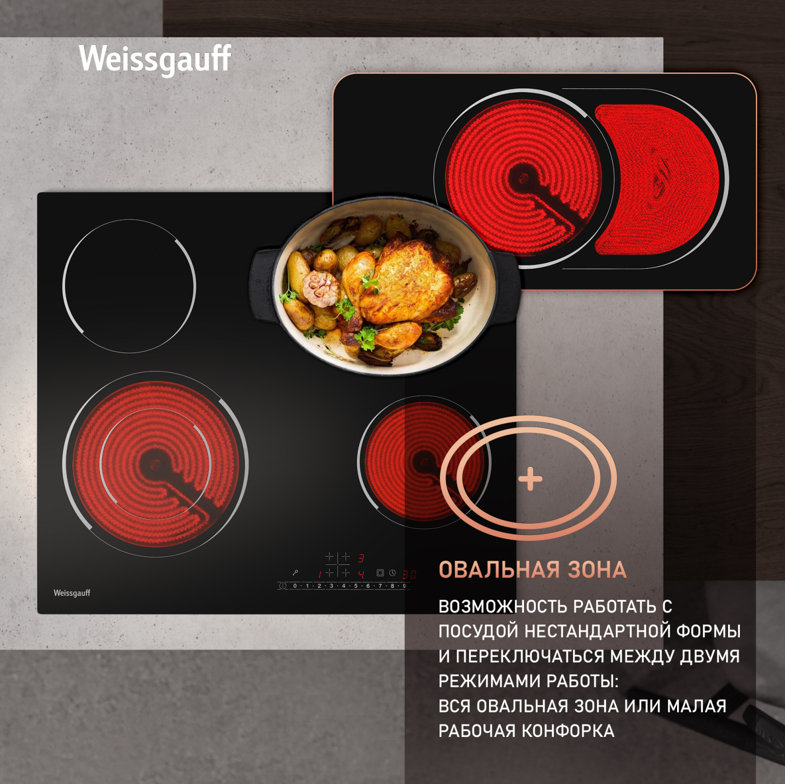 Стеклокерамическая панель с металлической рамкой, дополнительной овальной зоной и двухконтурной конфоркой сочетает в себе возможности приготовления в посуде разной формы и диаметра по более, чем доступной цене. Золотая середина варочных панелей Weissgauff.