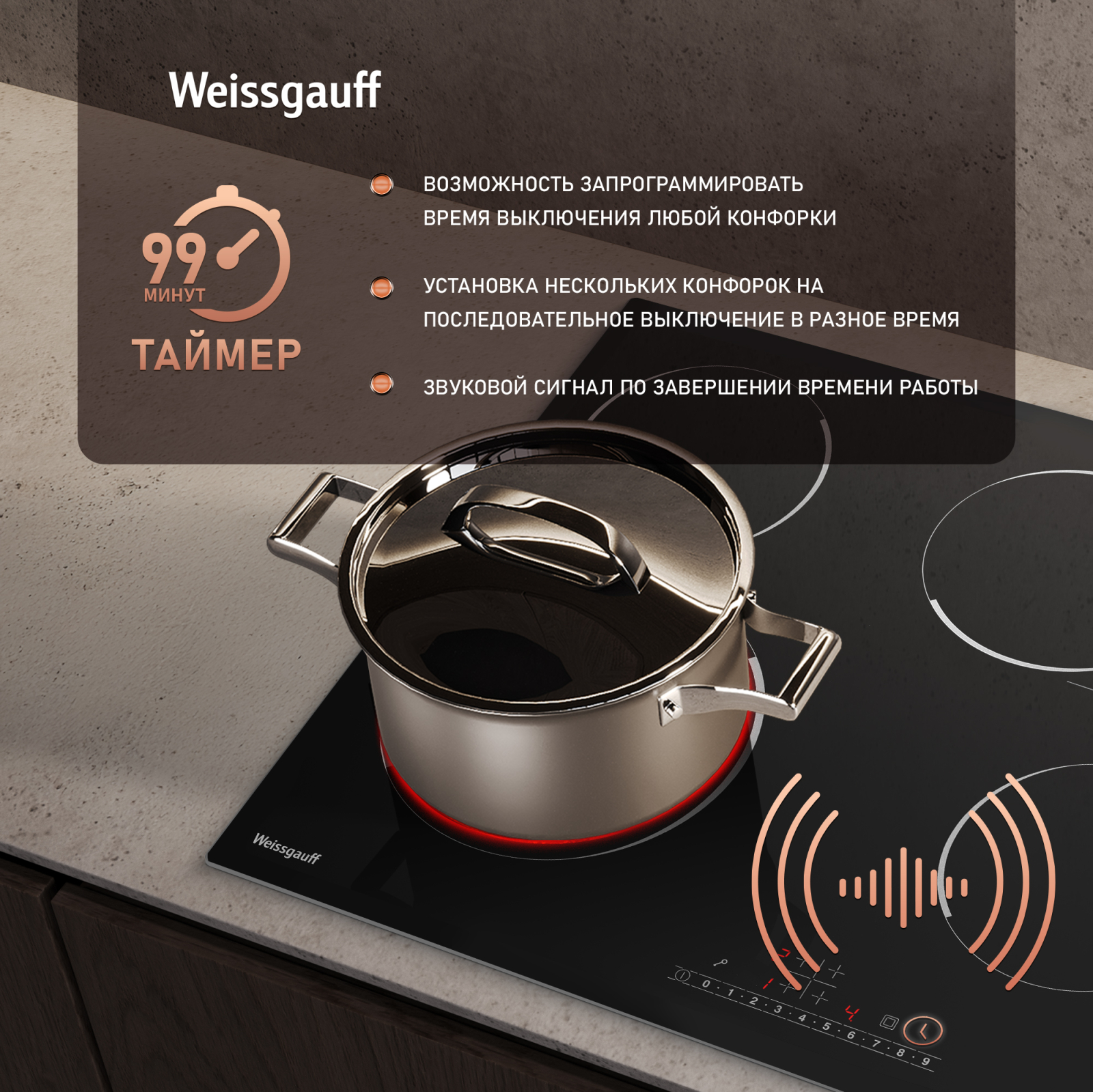 Таймер до 99 минут дает вам возможность запрограммировать время выключения любой конфорки, с точностью до минуты!