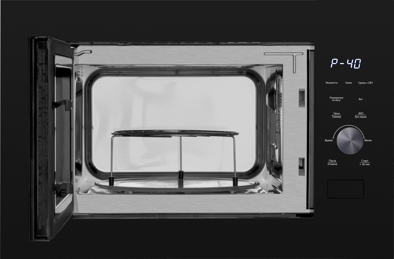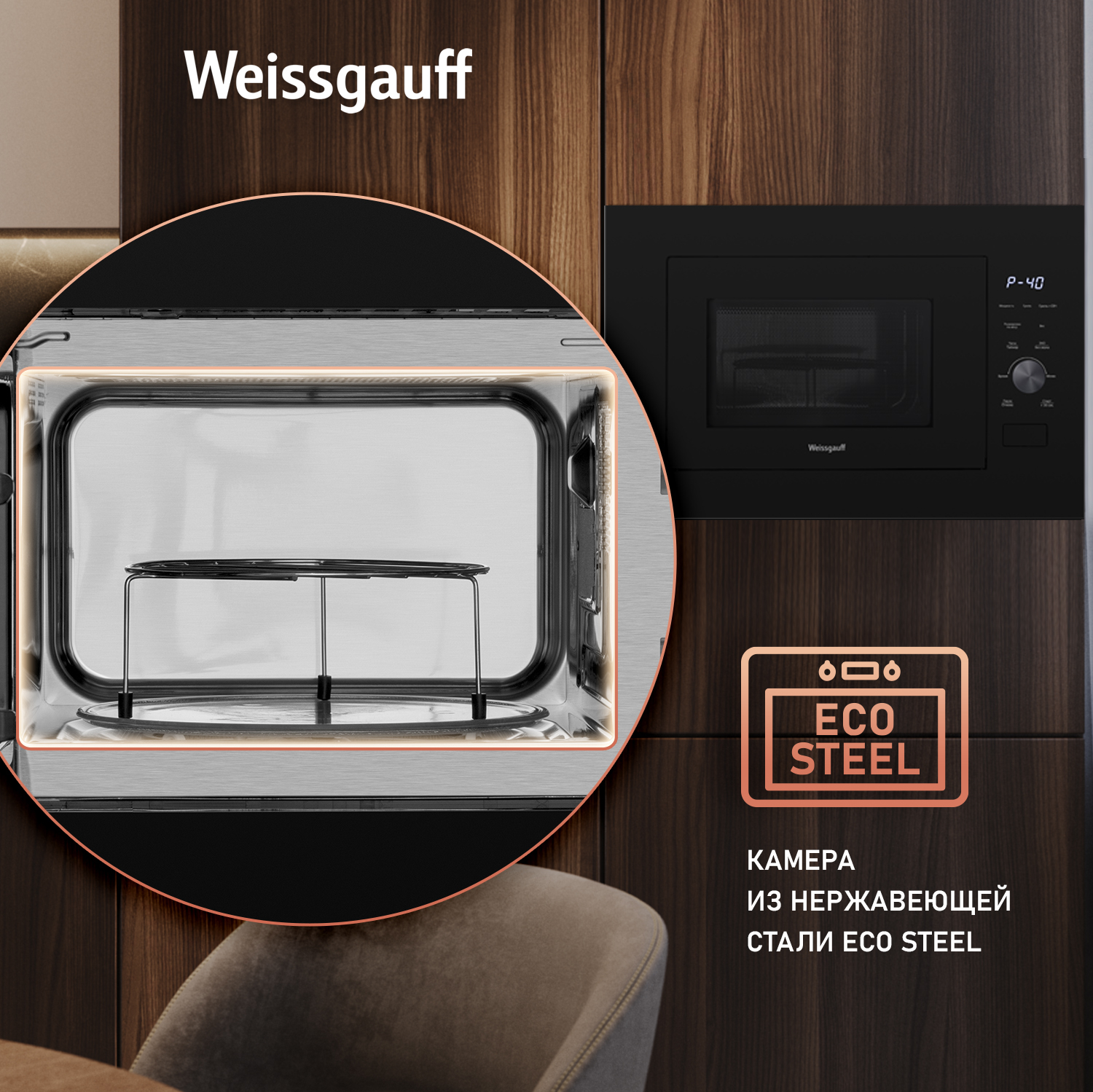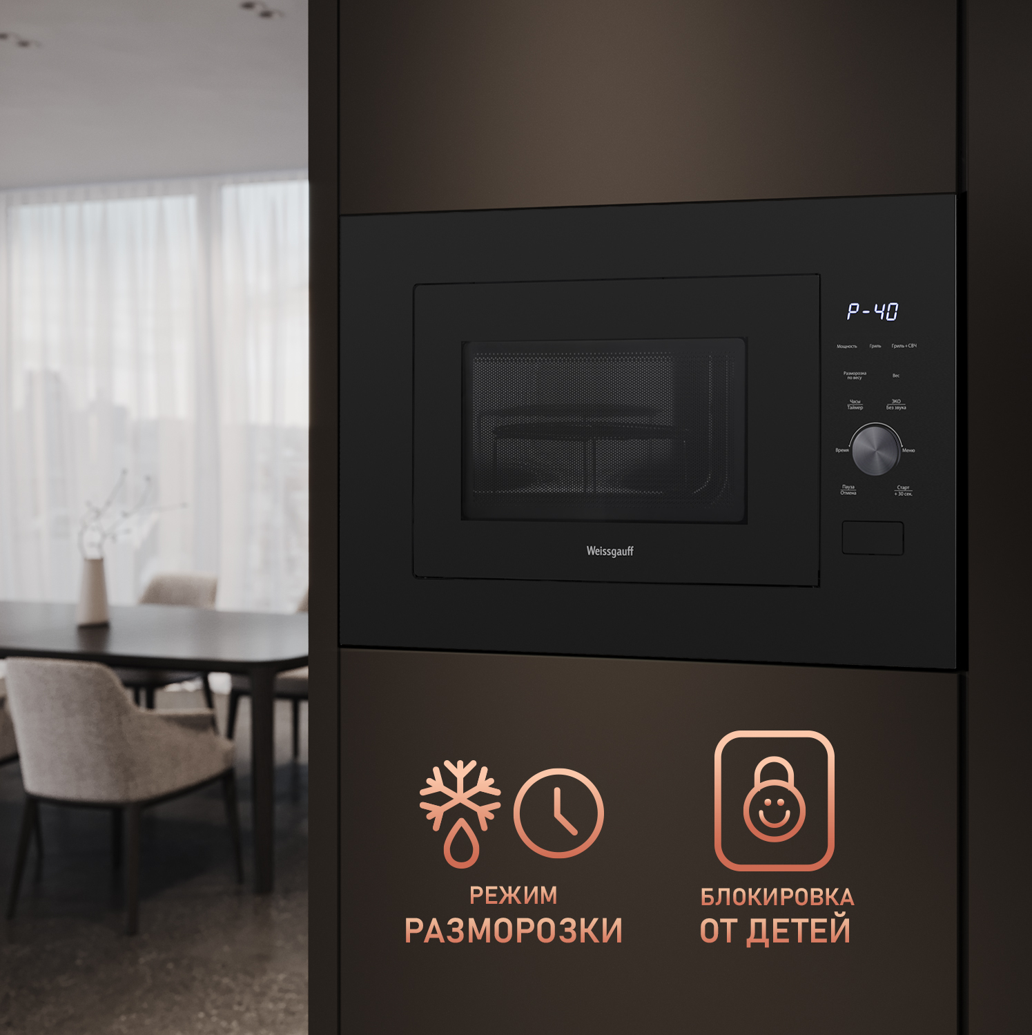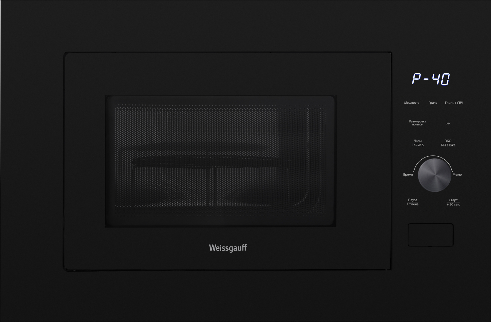 Встраиваемая микроволновая печь Weissgauff с объемом 25 литров, выполненная в черном цвете, равномерно разогревает еду при помощи поворотного стола, а также оснащена грилем с возможностью работы в комбинированном режиме и набором программ автоменю!