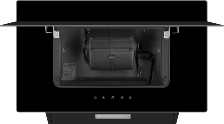 Дизайн, выполненный в черном закаленном стекле, открывает возможность гармоничного использования этой вытяжки в самых разных вариантах дизайна кухни.