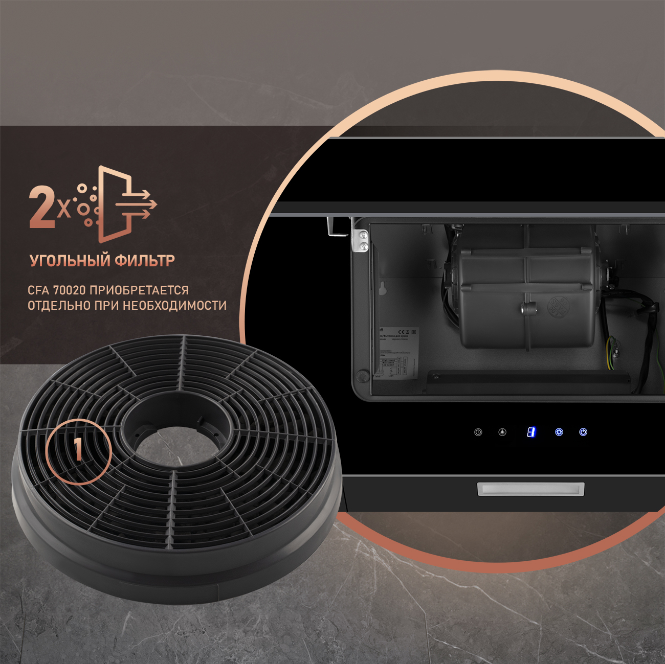 Возможность установки угольного фильтра станет отличным решением для вытяжки, работающей в режиме рециркуляции, позволяющим повысить эффективность очистки воздуха и избавиться от нежелательных запахов!