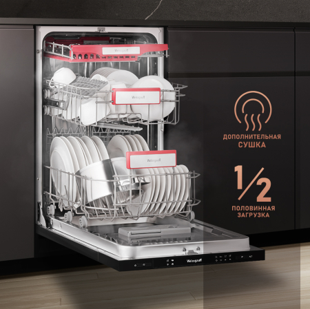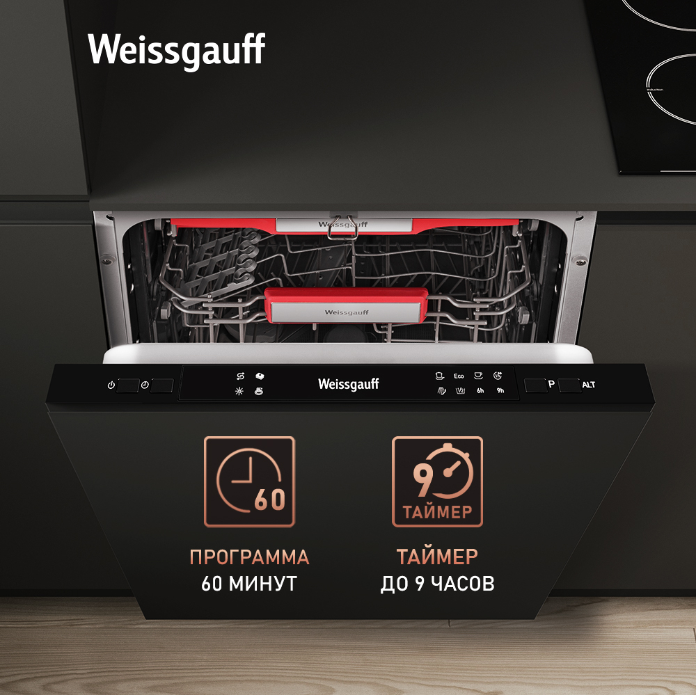Weissgauff представляет вашему вниманию новую модель встраиваемой посудомоечной машины шириной 45 см, оснащенную 3 корзинами и обладающую вместимостью до 11 комплектов посуды, а также функциональным набором из 5 программ.