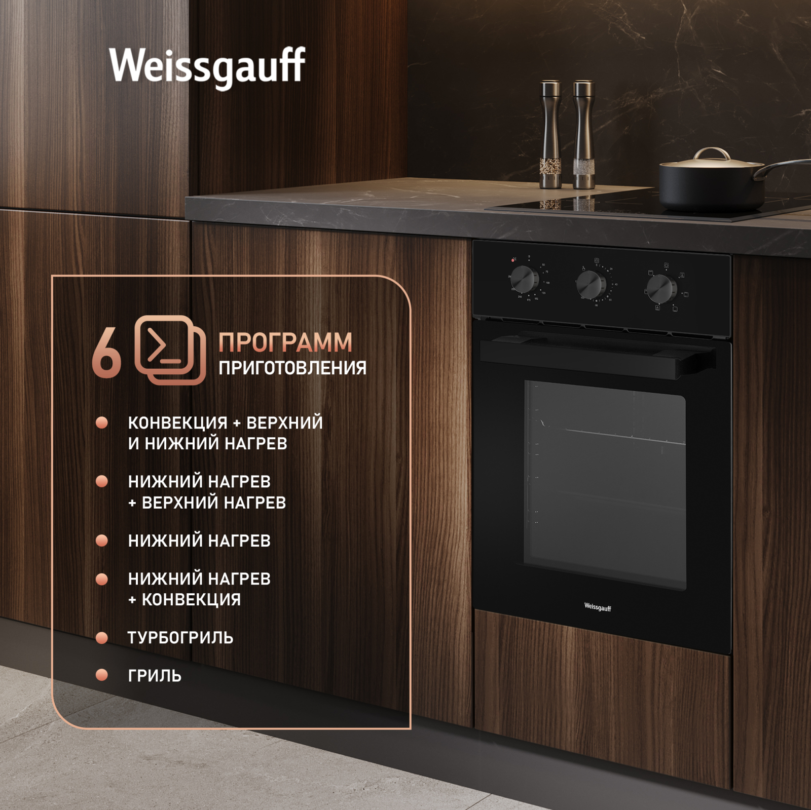 Объем 50 литров дает вам полную уверенность в том, что приобретая этот духовой шкаф, вы сможете разместить в нем сразу весь необходимый объем пищи, и даже профессионально работать на нескольких уровнях одновременно, порадовав себя и своих близких настоящим пиром, приготовленным в духовом шкафу Weissgauff на действительно ресторанном уровне.