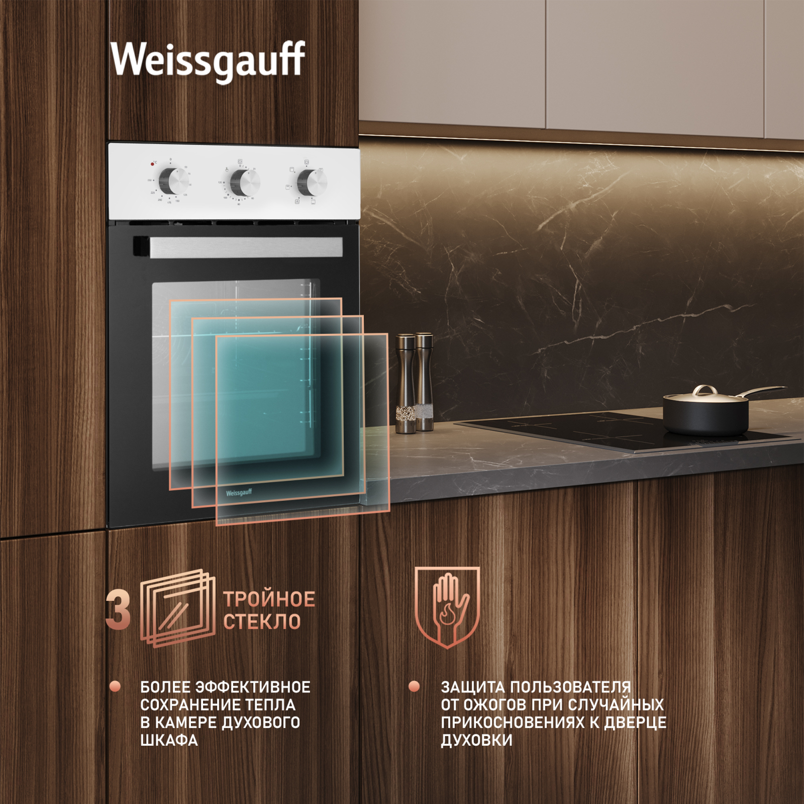 Тройное стекло дверцы, воплощающее в себе весь подход к безопасности и термозащите, который Weissgauff реализовали в данной модели. Такое стекло обеспечивает вам значительно большую степень защиты при случайных прикосновениях к нагревающейся дверце плиты, чем в моделях, не оснащенных технологией многослойного стекла. Для нас в Weissgauff важно, чтобы работа с бытовой техникой была не только приятной, но и безопасной!
