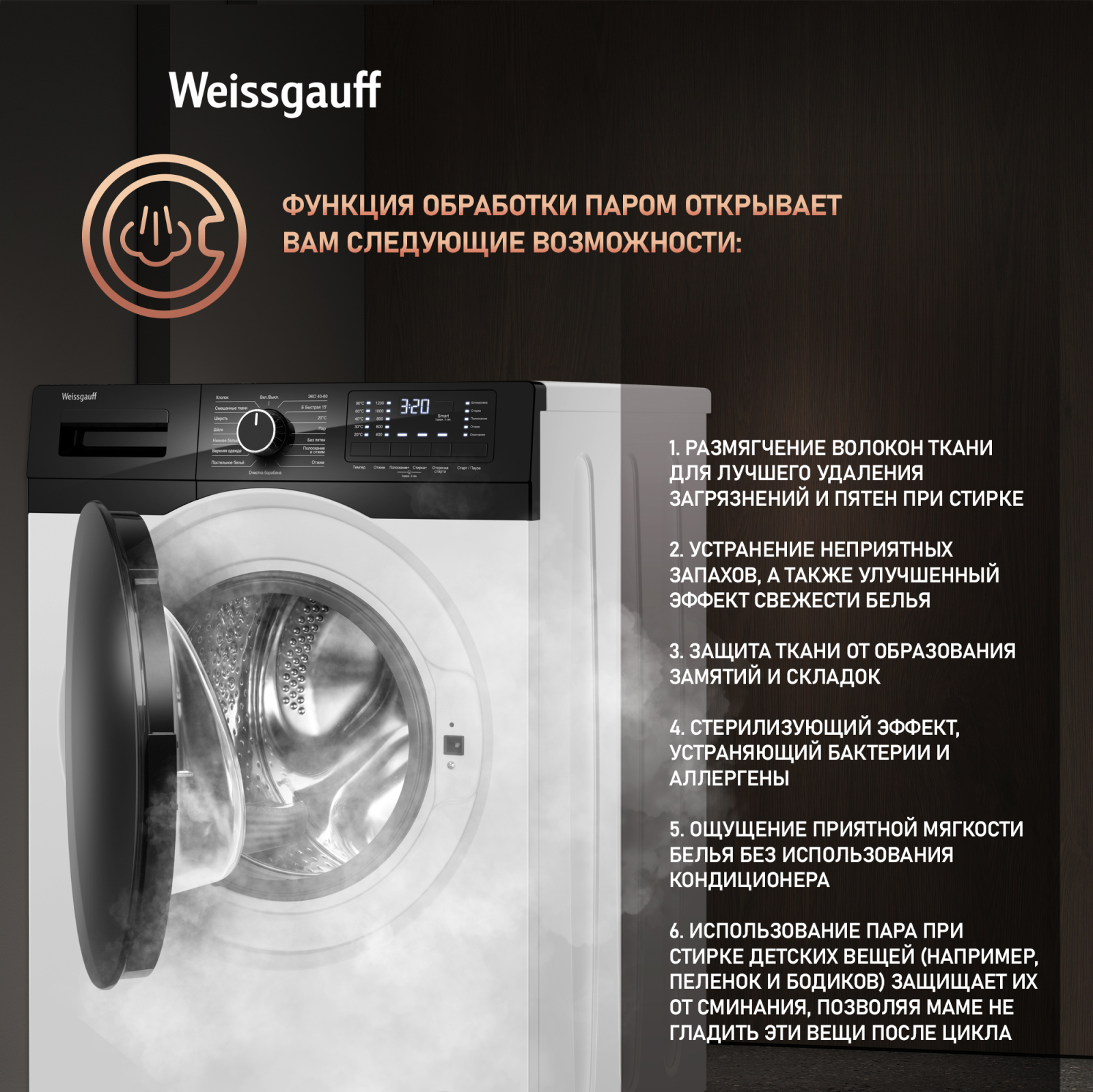 Функция "Пар" - это инновационное решение от компании Weissgauff, которое позволит придать свежести вещам, а также устранить неприятный запах, легкие загрязнения и складки на одежде, бережно сохраняя при этом структуру волокон ткани. При выборе данной функции, пар добавляется в ходе цикла в процессе работы программы.