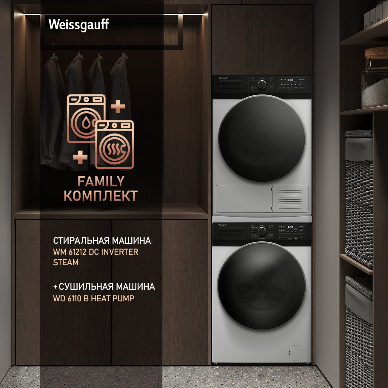 FAMILY- комплект! Данная модель идеальна для установки в колонну с сушильной машиной Weissgauff WD 6110 B Heat Pump, образуя цельный и гармоничный комплект бытовой техники, выполненный в едином дизайне! Обратите внимание, что для установки в колонну потребуется дополнительно приобрести соединительный элемент Weissgauff WSK 19300.