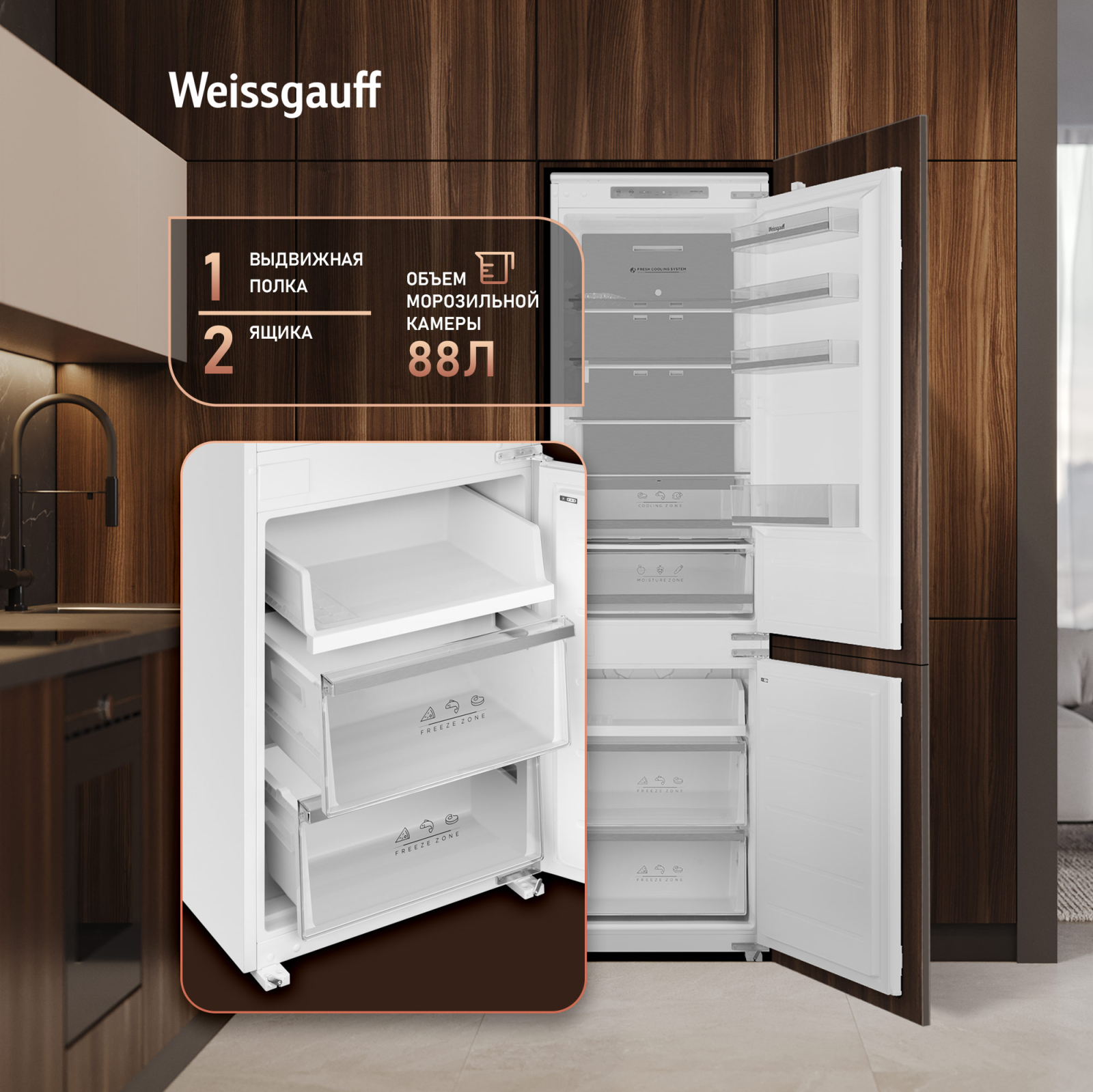 Cупер тихий встраиваемый холодильник от Weissgauff с уровнем шума 35 дБ, обладающий инверторным двигателем, объемом 307 литров с полной системой размораживания NoFrost для холодильной и морозильной камеры, - это воплощение передовых инженерных решений Weissgauff по действительно доступной цене!