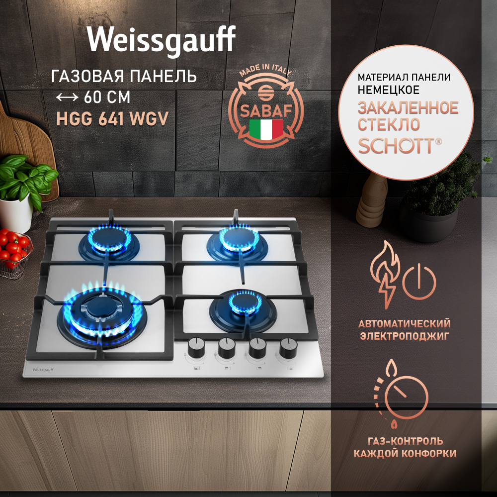 Варочная панель Weissgauff, оснащённая системой "Газ-контроль" и мощной WOK-конфоркой, создающей сразу 3 независимых контура пламени - это наиболее современная и функциональная модель Weissgauff, исполненная в белом закалённом стекле