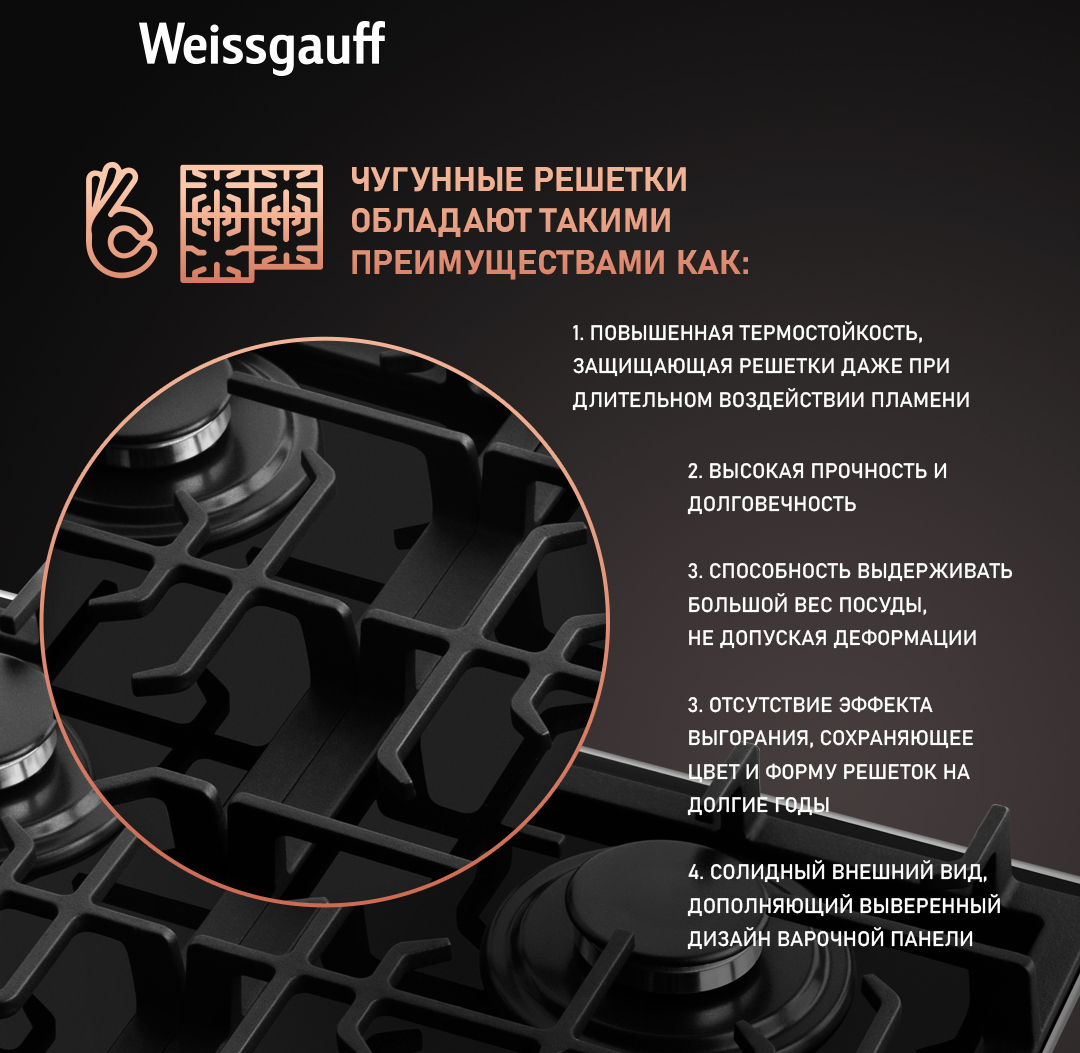 Решетки из высококачественного чугуна это неизменное качество, надежность и долговечность, воплощенные в каждой детали! А особая элегантность их дизайна не только послужит отличным дополнением к общему стилю варочной панели, но и существенно облегчит очистку и уход за ней. А благодаря особому вниманию Weissgauff к каждой детали, вы еще не раз оцените устойчивость и эргономичность этих решеток!