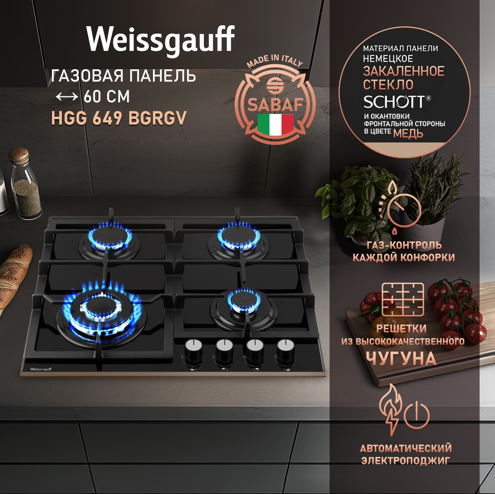 Варочная панель Weissgauff, оснащённая системой "Газ-контроль" и мощной WOK-конфоркой, создающей сразу 2 независимых контура пламени - это наиболее современная и функциональная модель Weissgauff, исполненная в сочетании чёрного закалённого стекла и окантовки передней панели в цвете "медь".