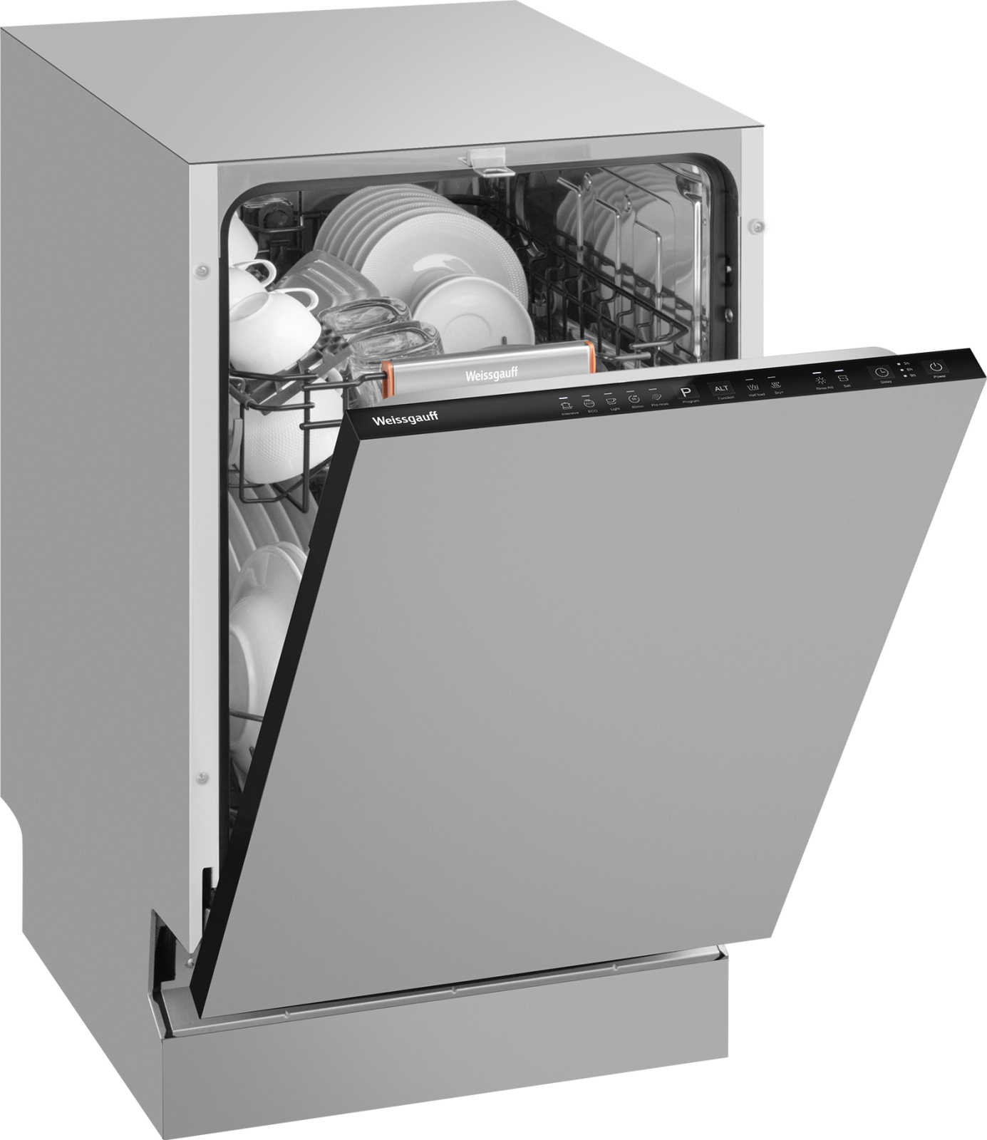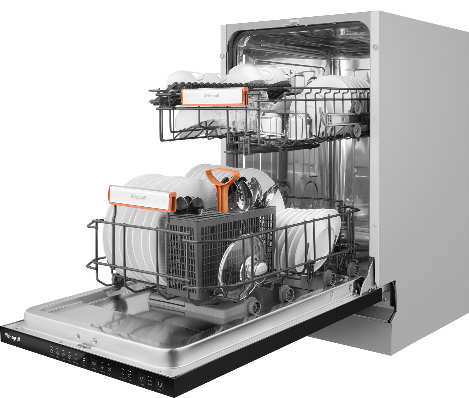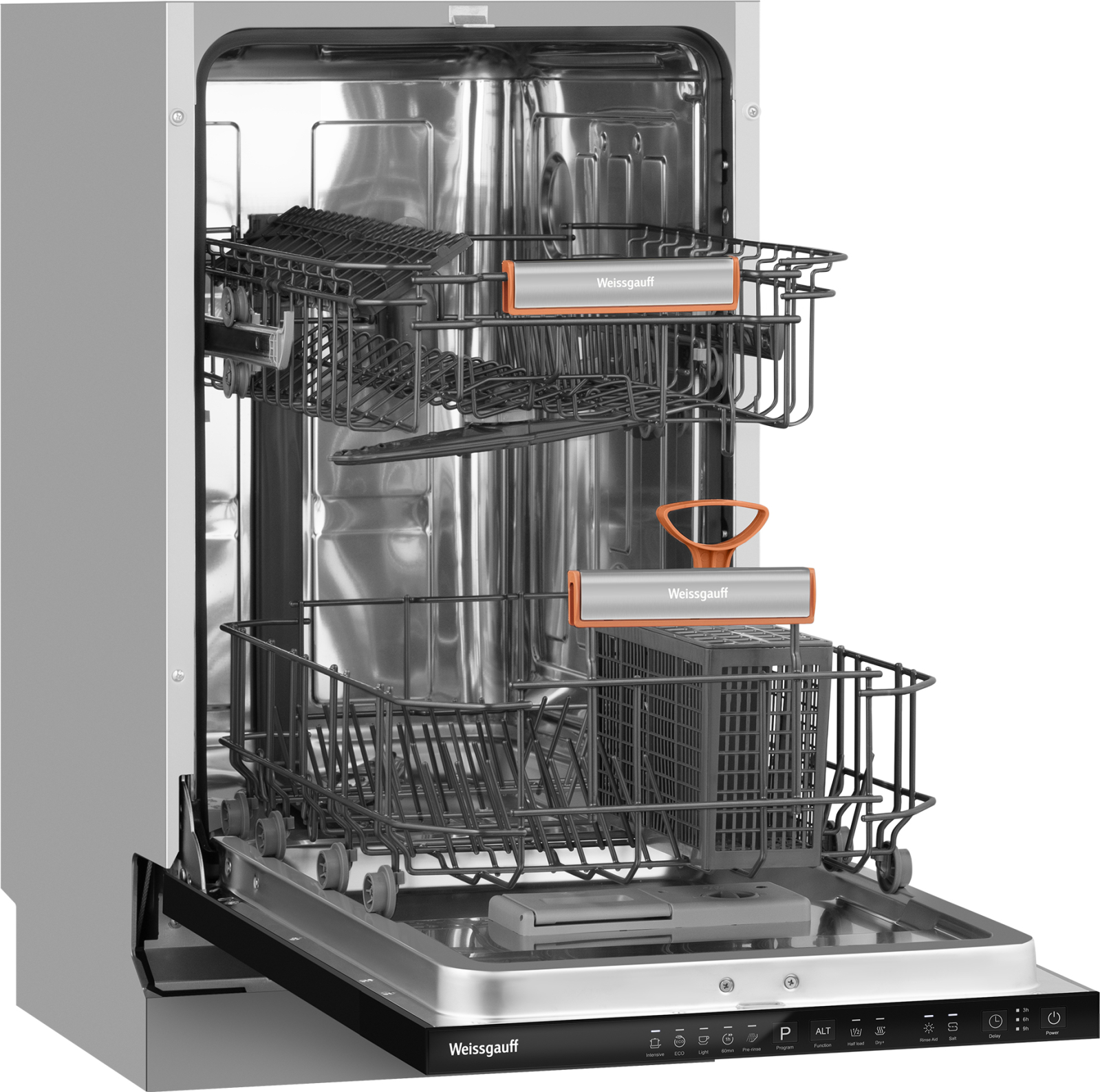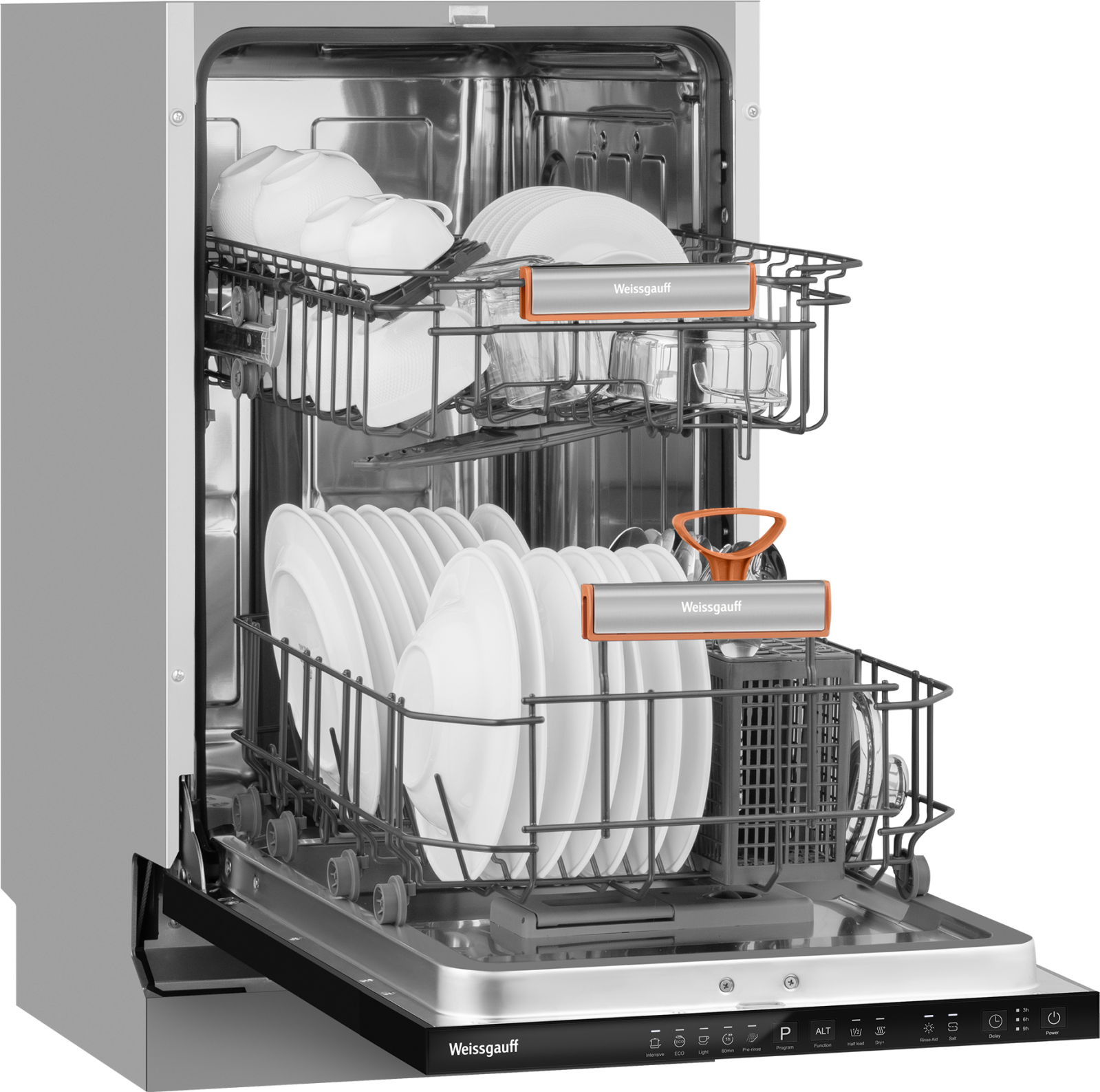 До 9 комплектов посуды одновременно вы можете расположить в данной посудомоечной машине, благодаря современным продуманным и эргономичным корзинам, которыми Weissgauff оснастили эту модель!