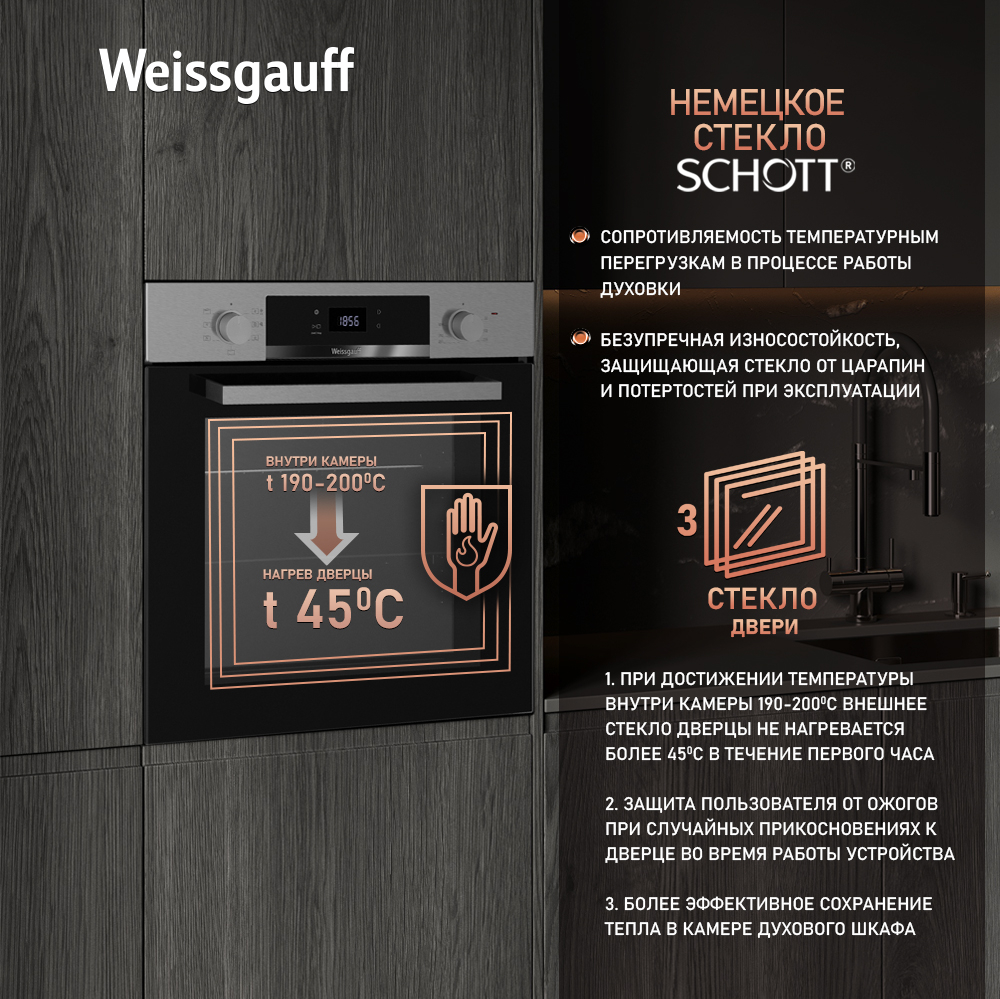 Великолепный дизайн, дополненный вставкой из стекла под дисплеем, станет финальным штрихом в совершенстве облика этой модели. Каждый раз, взаимодействуя с духовым шкафом от Weissgauff, вы будете в полной мере ощущать, как он способен нагревать не только еду, но и согревать душу, став настоящим сердцем вашего уютного домашнего очага