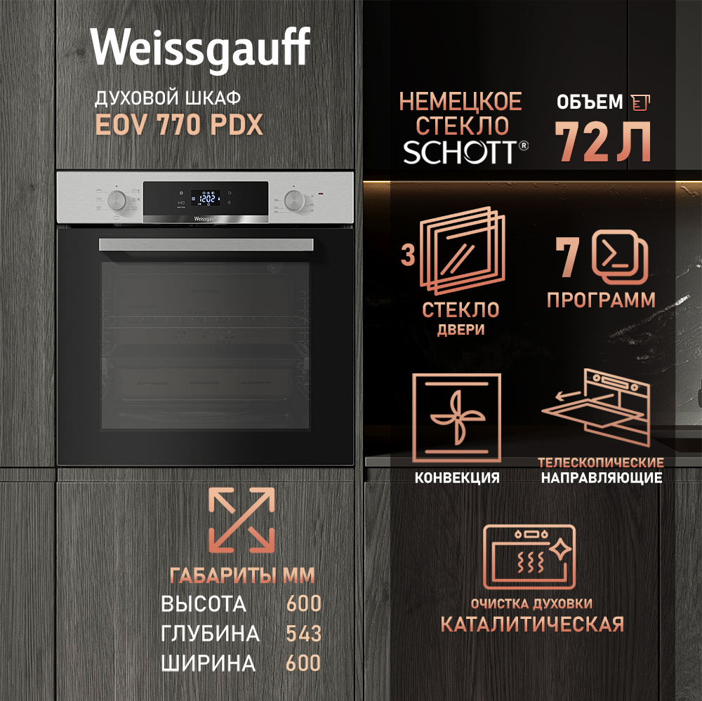 Новое поколение электрических духовых шкафов от Weissgauff предлагает модель, выполненную в цвете "нержавеющая сталь". Управление, реализованное сочетанием чувствительного сенсорного блока и утапливаемых рукояток PIPO, дополняет богатый функционал, представленный сразу 7 режимами! А фантастический увеличенный объем XL 72 литра дополнит совершенство возможностей этого устройства! Благодаря всему этому вы сможете полностью управлять процессом приготовления пищи, добиваясь идеального результата каждый раз! Духовой шкаф Weissgauff станет не только отличным приобретением для вашей кухни, но и настоящим украшением интерьера, отражающим все благородство вашего вкуса и стиля!
