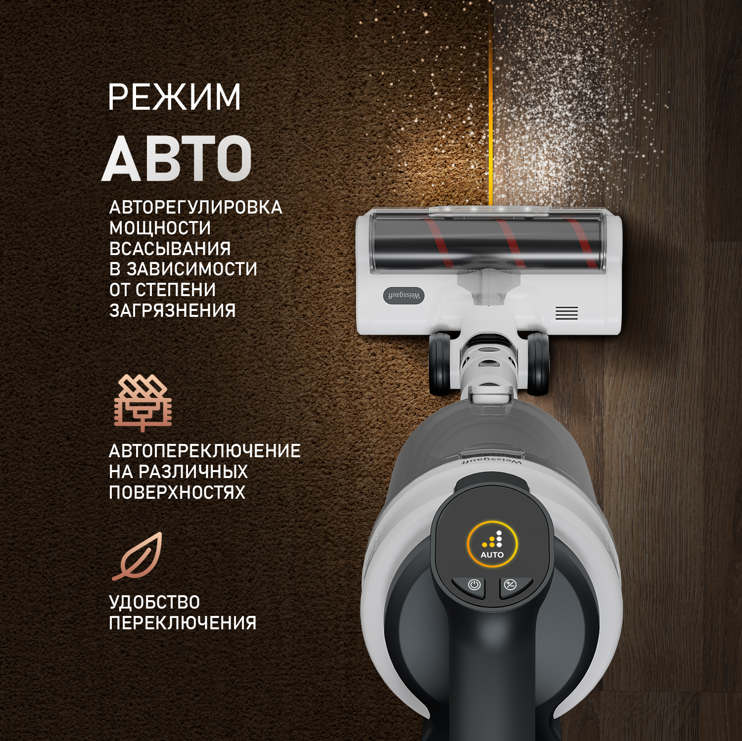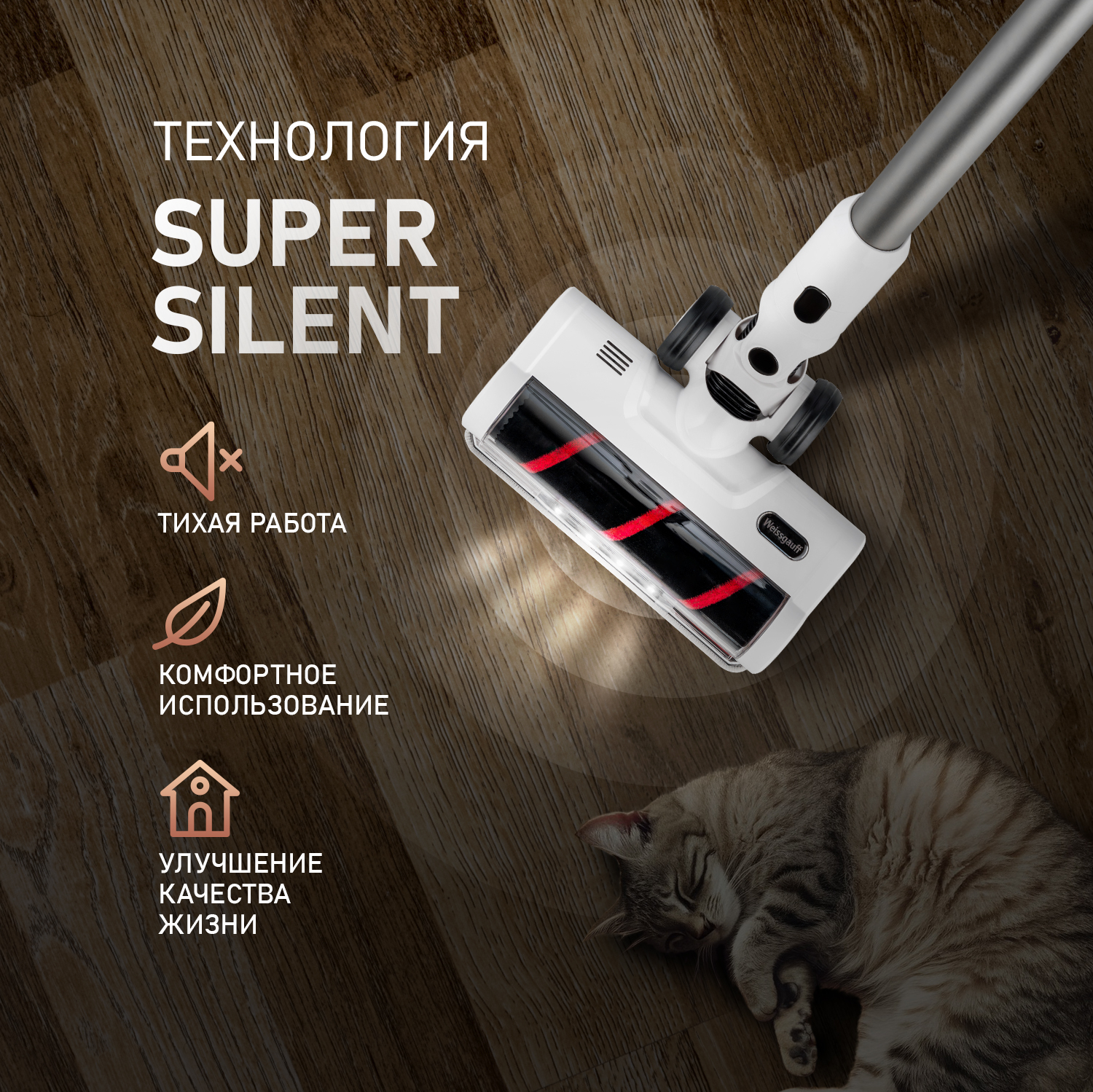 Weissgauff представляет Вашему вниманию новый сверхмощный вертикальный пылесос оснащенный специальной турбощеткой для паркета и ламината, он эффективно удаляет пыль, не повреждая при этом поверхности пола.