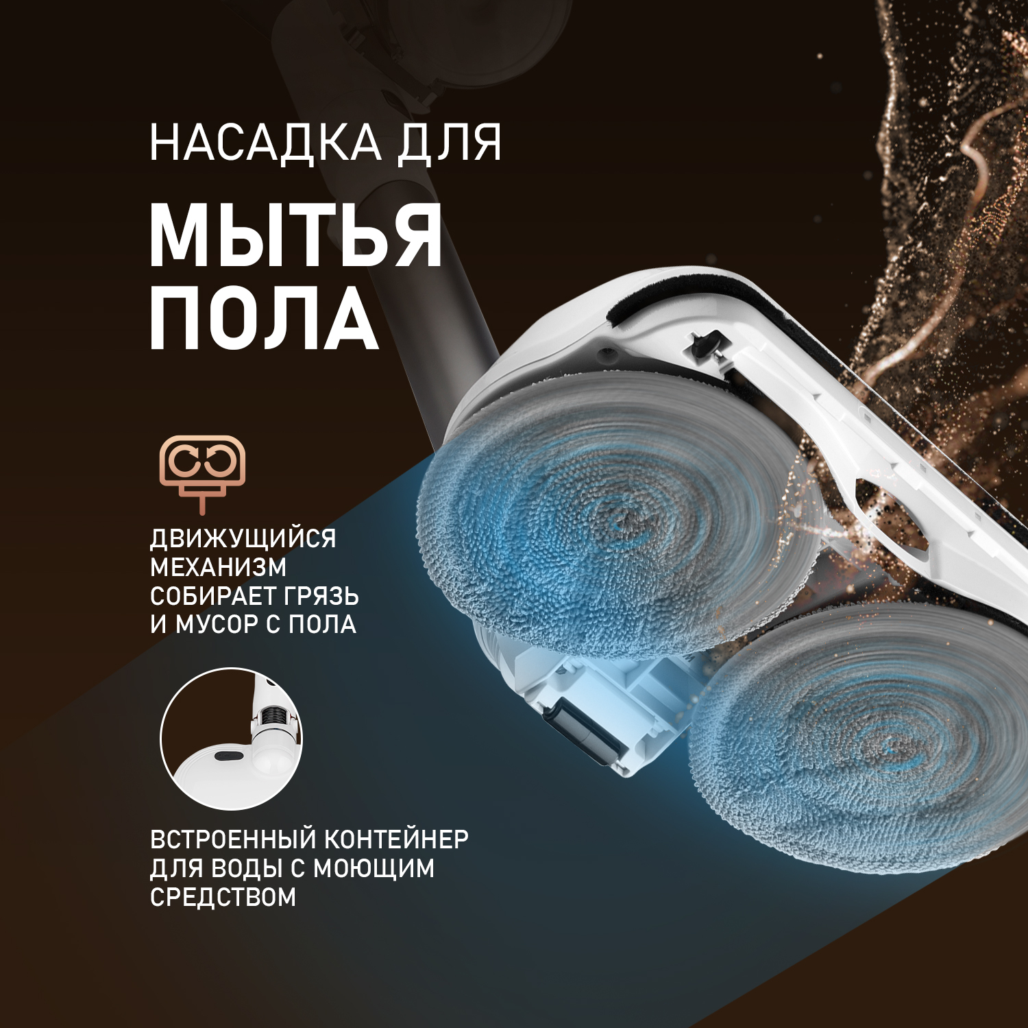 Режим влажной уборки, реализованный благодаря специальной насадке, оснащенной резервуаром для залива воды, позволит использовать этот пылесос не только для сбора пыли, но и для полноценного качественного мытья пола!