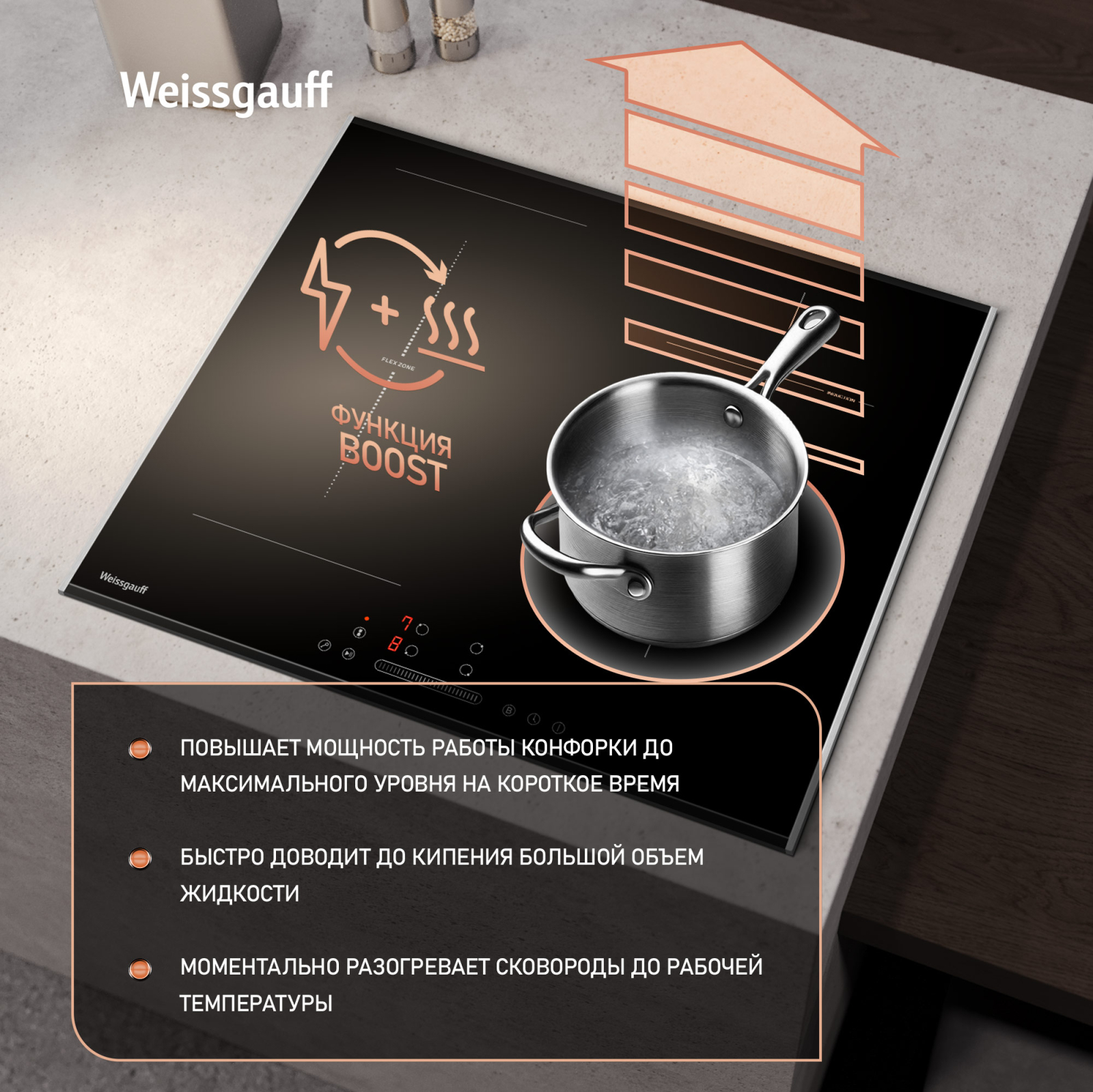 Опция Boost это удобная функция, позволяющая направить весь потенциал индукционной панели в одну рабочую зону и, тем самым, значительно увеличить эффективность и скорость нагрева