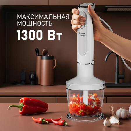 • Погружной блендер 4 в 1, способен заменить 4 кухонных устройства: блендер, миксер, измельчитель и пресс для картофельного пюре. Благодаря высокой мощности 1300 Вт устройство дольше работает под нагрузкой и качественно справляется с измельчением и взбиванием самых разных продуктов.