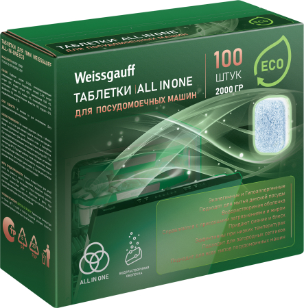 Способ применения: загрузить посуду в машину, предварительно удалив остатки пищи. Не снимая защитную пленку, поместить ее в дозировочный контейнер для моющего средства согласно инструкции к Вашей посудомоечной машине, затем выбрать программу мойки. При мойке рекомендуется использовать таблетки вместе с солью и ополаскивателем Weissgauff для посудомоечных машин, которые приобретается отдельно. Внимание: не класть таблетки в корзину для столовых приборов или посуды. Не помещать в машину одновременно изделия из серебра и нержавеющей стали. Не использовать посудомоечную машину для мойки деревянных изделий.