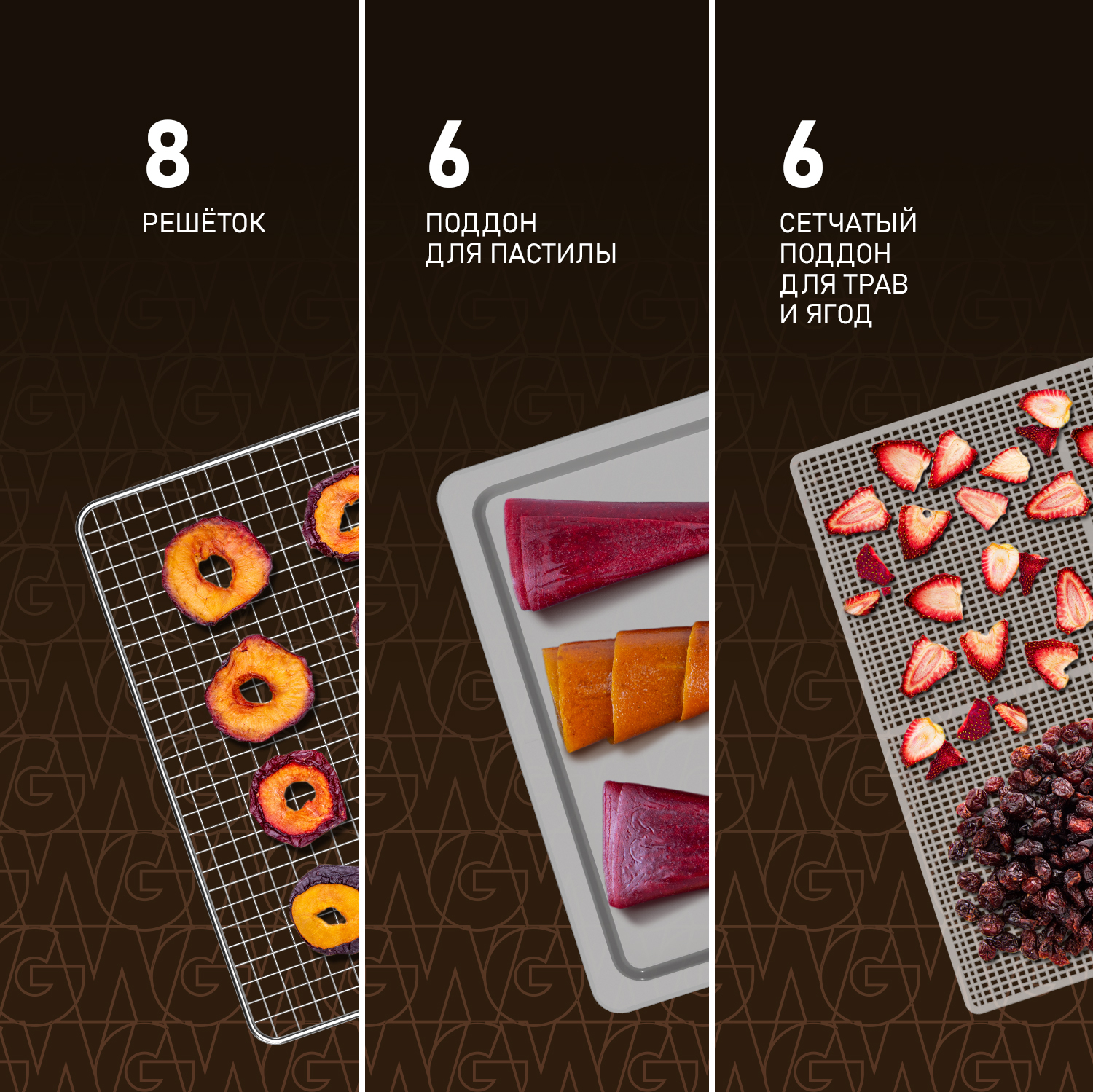 | Комплектация: | Решётки 8 шт., Поддоны для пастилы 6 шт., Сетка для трав 6 шт. |