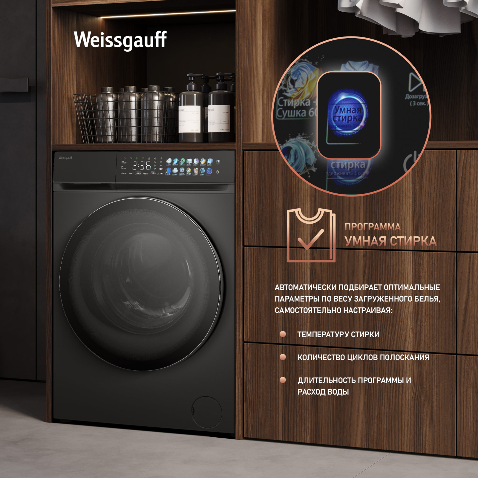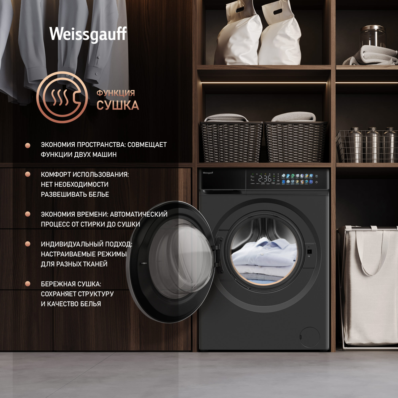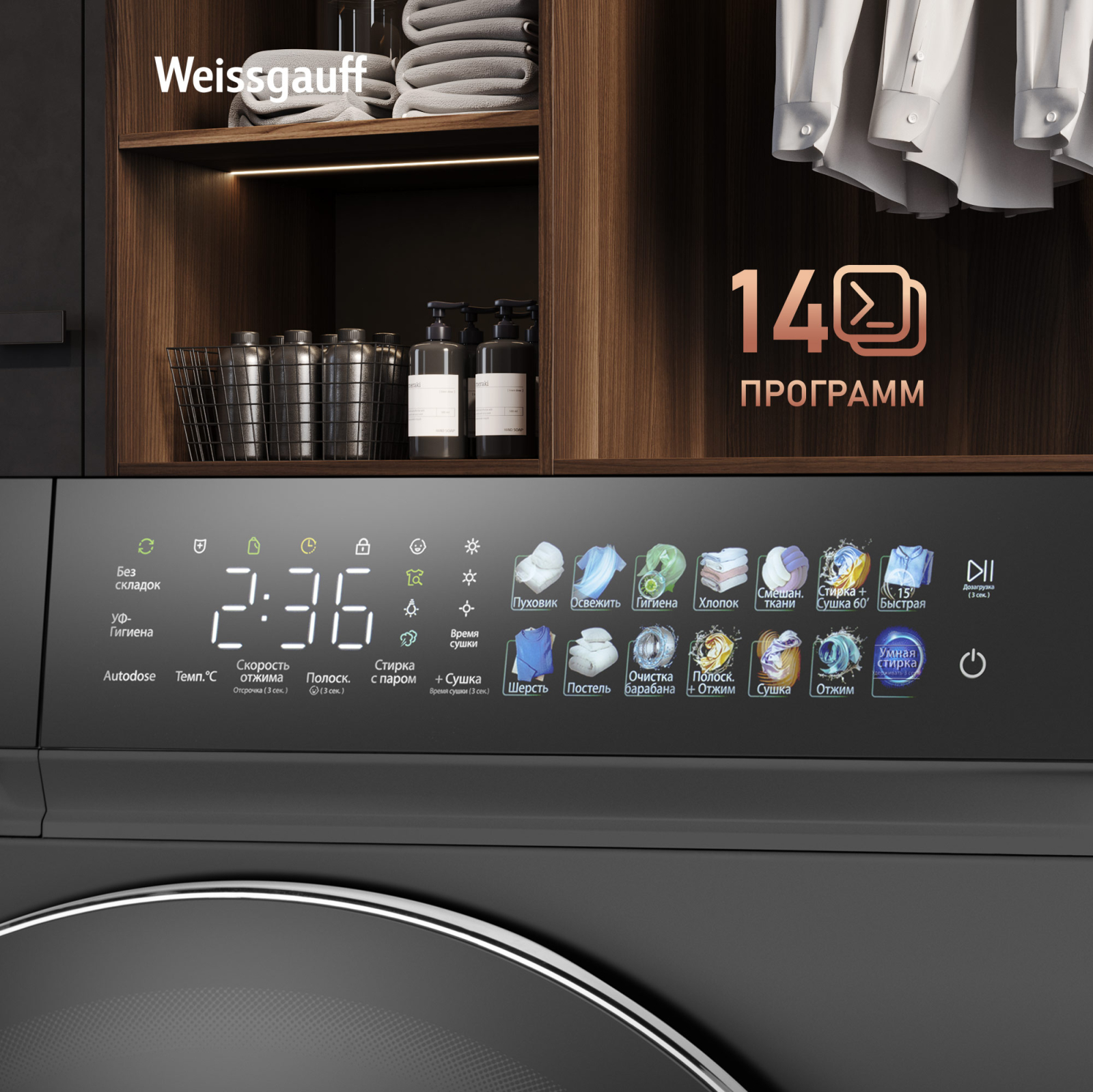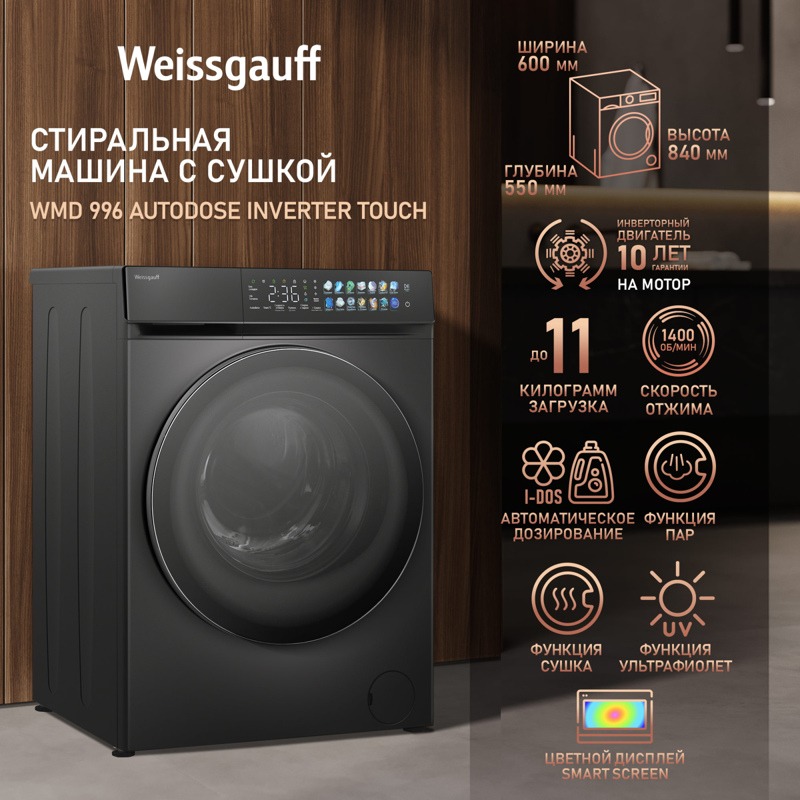 Отдельностоящая стиральная машина Weissgauff с функцией сушки, оснащенная инверторным двигателем и функцией пара, имеющая показатели загрузки до 11 кг белья при стирке и до 7 кг белья при сушке, скорость отжима до 1400 оборотов в минуту, а также цветной дисплей SMART SCREEN и функцию автодозирования - это одна из наиболее передовых моделей Weissgauff в категории стиральных машин!