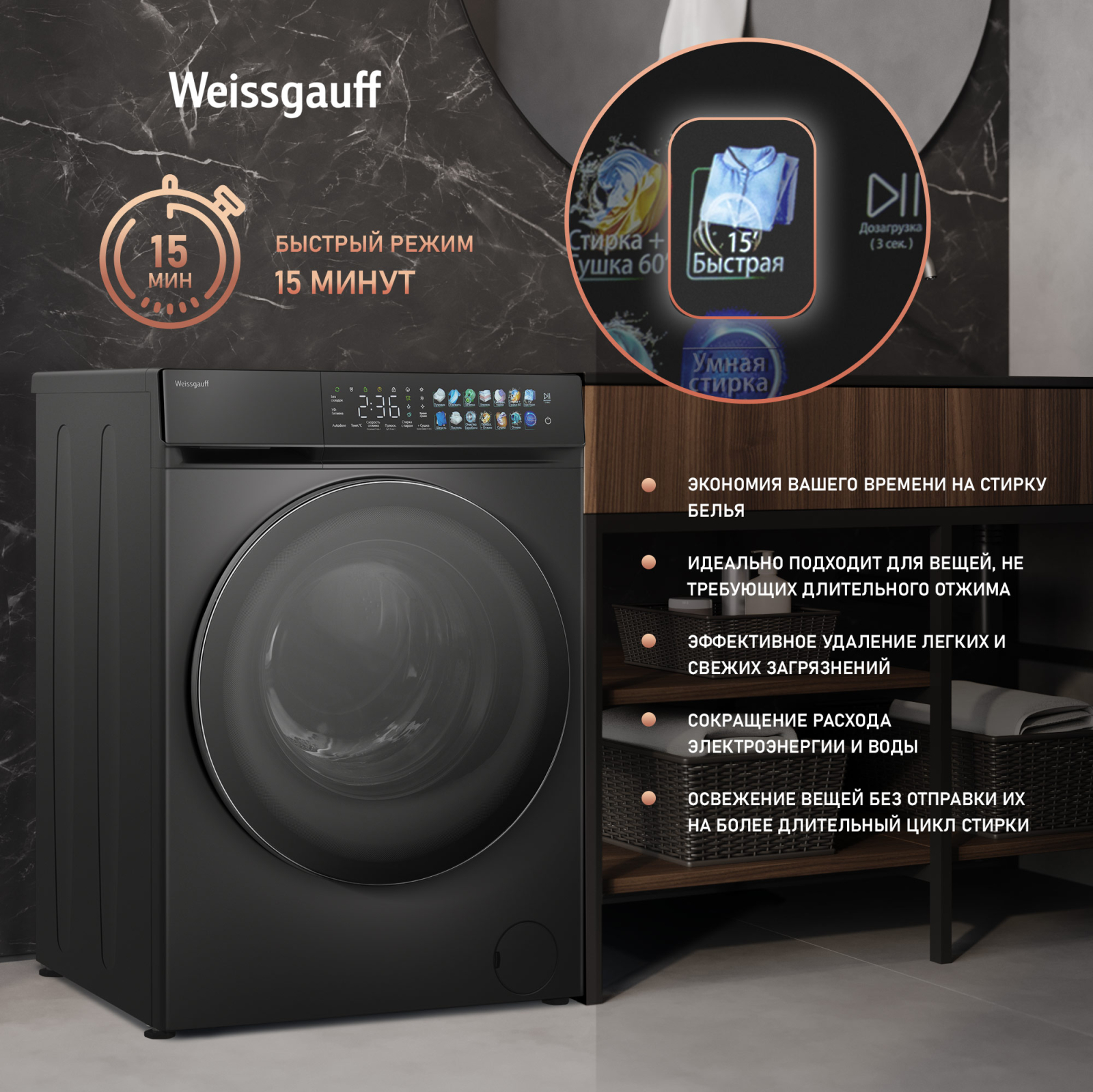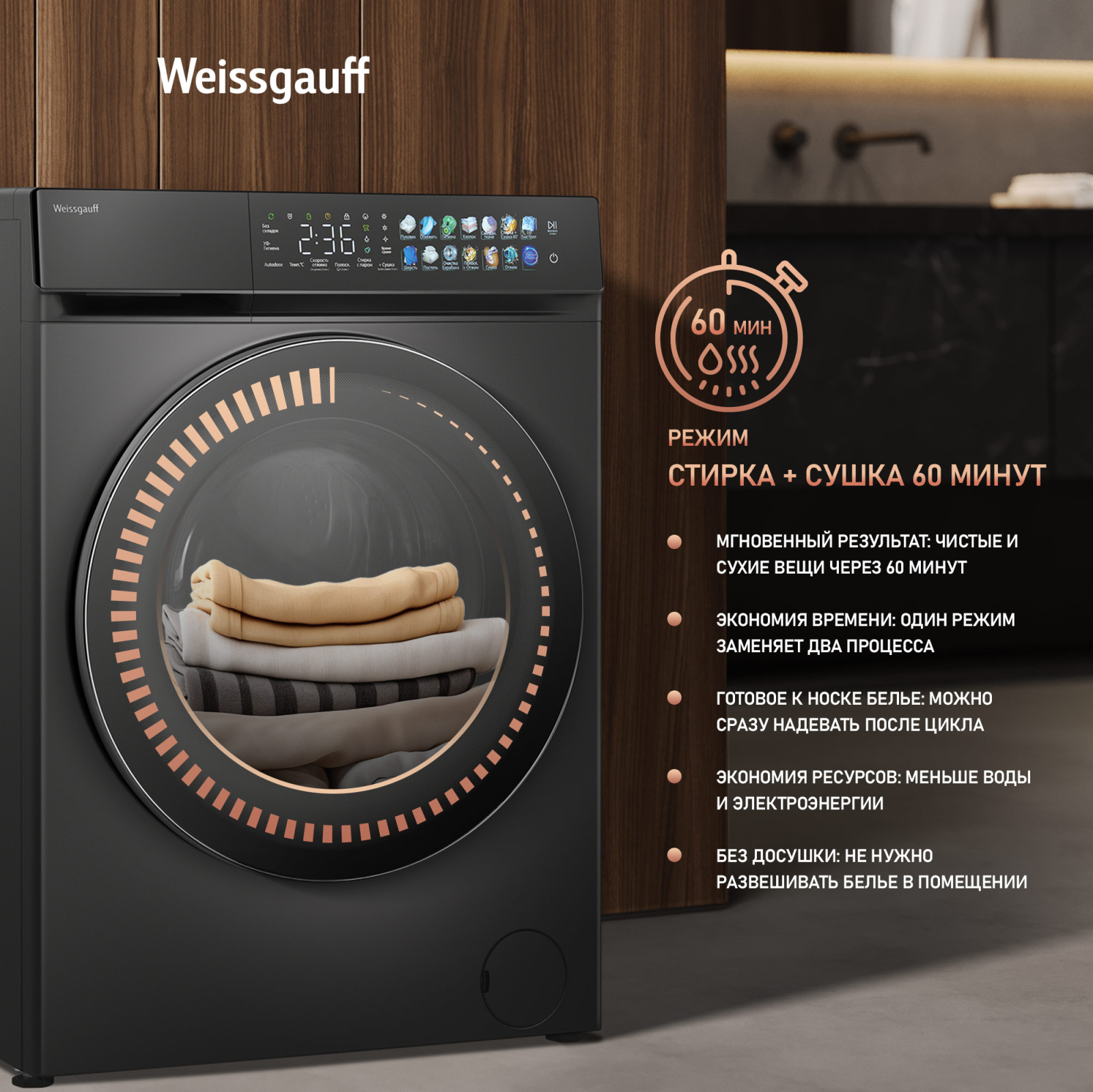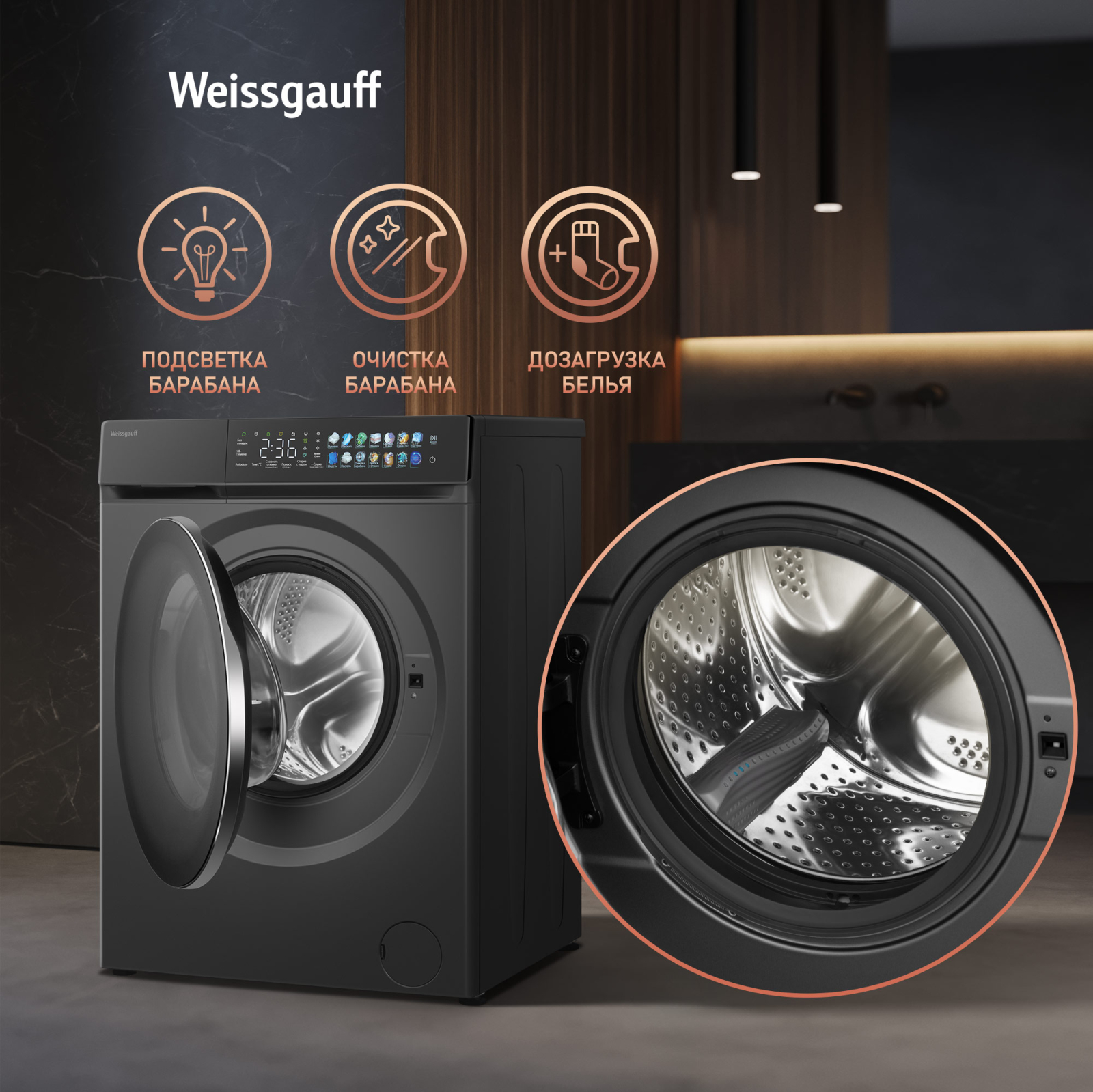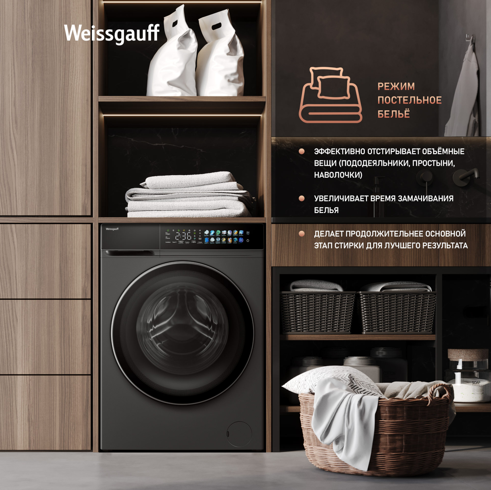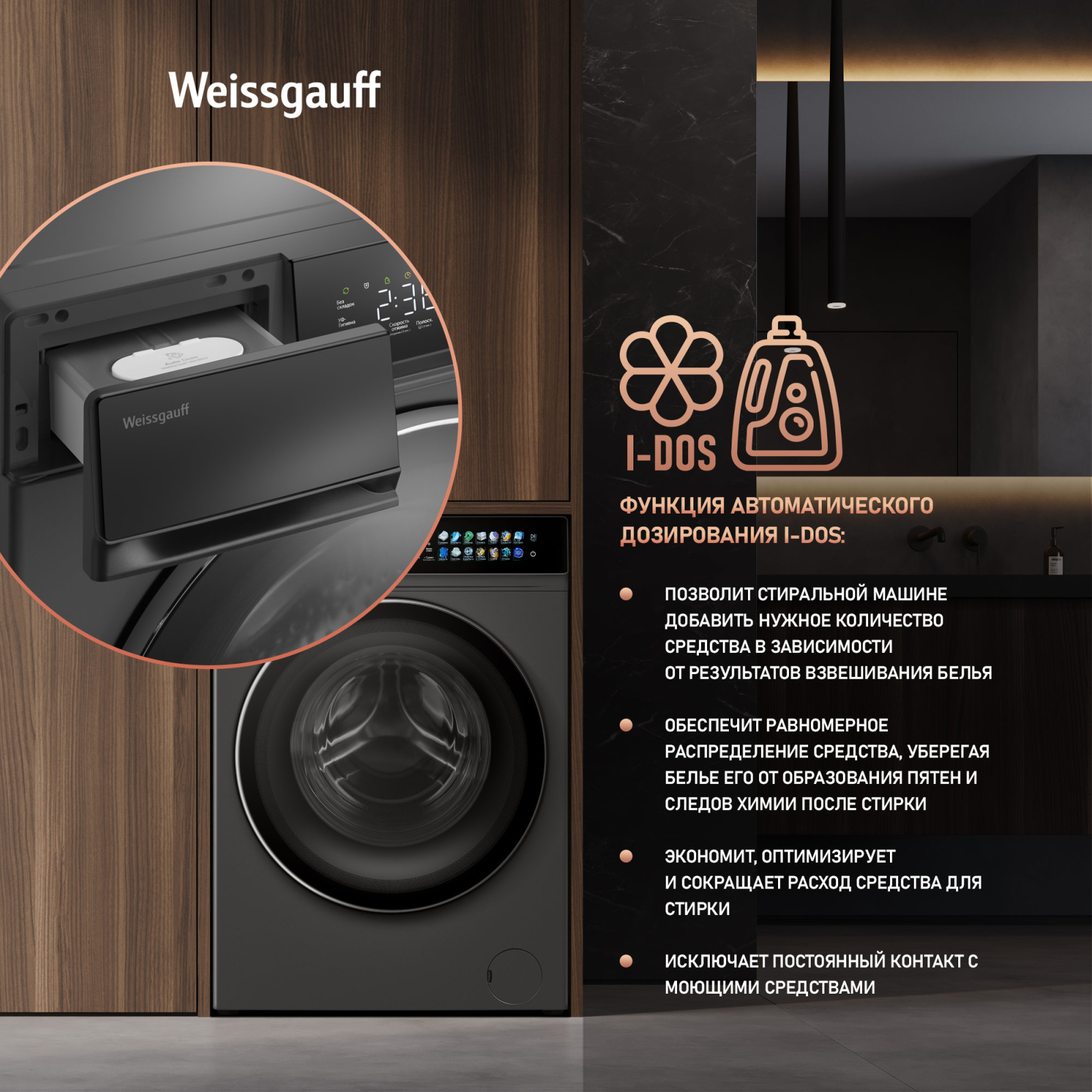 Отдельностоящая стиральная машина Weissgauff с функцией сушки, оснащенная инверторным двигателем и функцией пара, имеющая показатели загрузки до 11 кг белья при стирке и до 7 кг белья при сушке, скорость отжима до 1400 оборотов в минуту, а также цветной дисплей SMART SCREEN и функцию автодозирования - это одна из наиболее передовых моделей Weissgauff в категории стиральных машин!