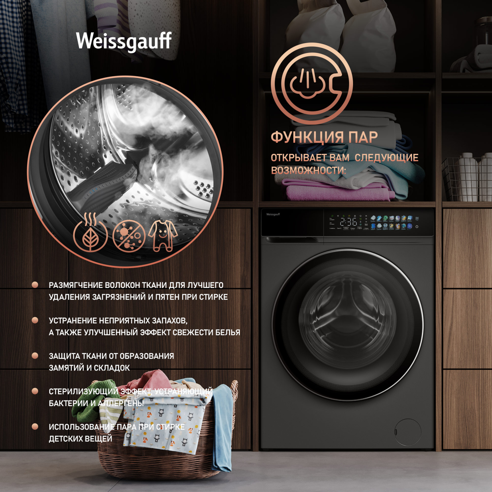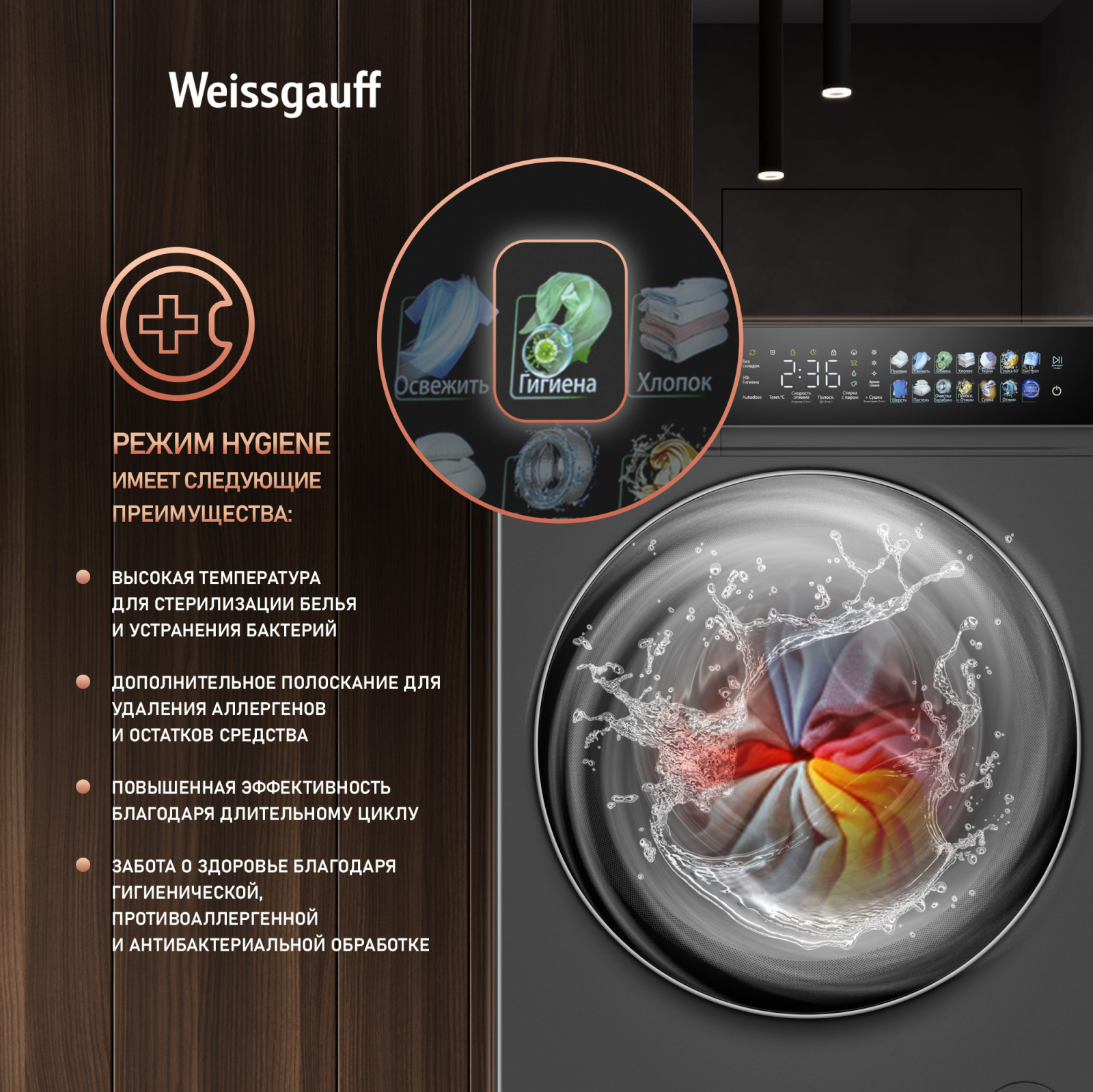 | Особые программы : | Стирка с паром, Гигиена, Умная стирка |