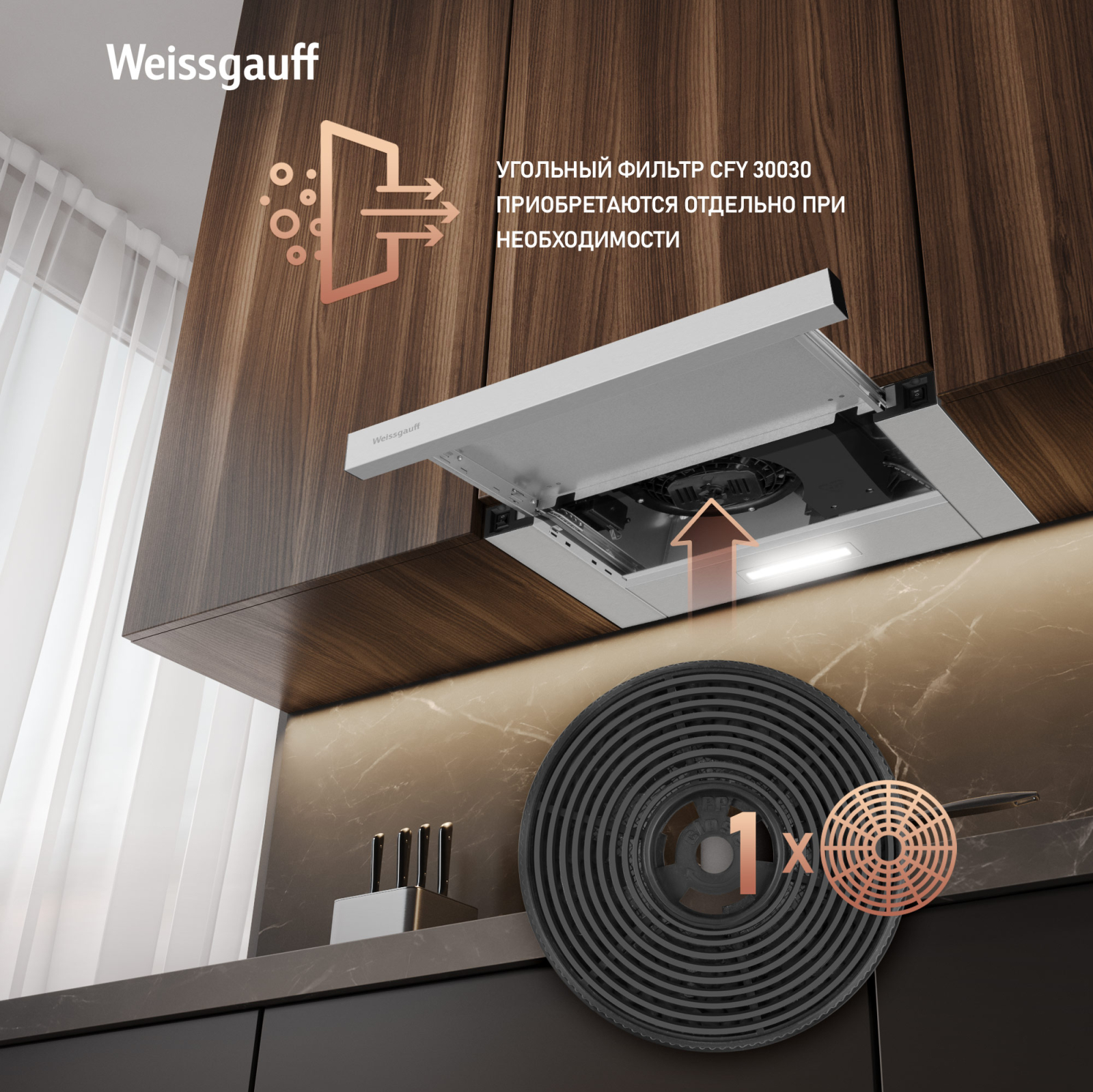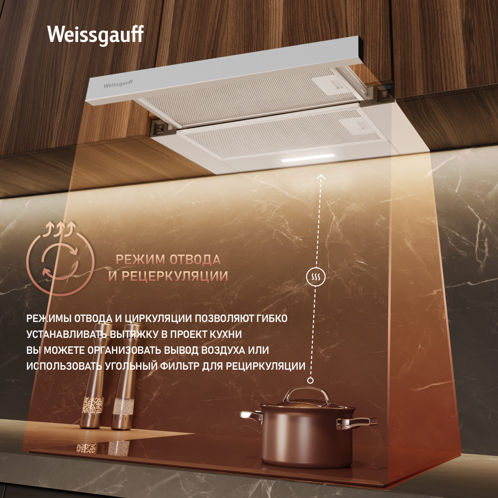 Работа в режимах отвода и циркуляции откроет вам широкие возможности по установке этой вытяжки в проект вашей кухни. Организуйте полноценный вывод воздуха из помещения или установите угольный фильтр и используйте вытяжку вместе с ним - какой бы вариант вы ни выбрали, модель от Weissgauff сделает это возможным!